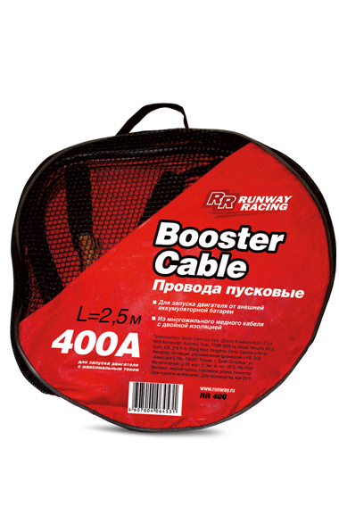 Пусковые провода RUNWAY RR400 — предназначен для пуска двигателя от внешнего источника электропитания (от аккумулятора другой машины). Провода изготовлены из многожильного медного кабеля с двойной изоляцией. Рассчитаны на использование при напряжении 12В или 24В. Максимальная сила тока 400А Длина 2,5м. Способ применения: Пуск двигателя от внешней аккумуляторной батареи. Прежде чем приступать к подключению внешнего аккумулятора, убедитесь, что: — выключено зажигание, все электрооборудование (световые приборы, стеклоочистители и пр.); — внешний аккумулятор имеет то же напряжение, что и ваш; обратите внимание на полярность подключаемого аккумулятора; — автомобили не касаются друг друга, включите стояночный тормоз и нейтральную передачу. Заверните вентиляционные пробки на обоих АКБ. Не пытайтесь запускать автомобиль с поврежденной АКБ. "Плюсовой" провод пусковых проводов с красными ручками на зажПроизводитель: ЗАО ТК «ПОИСК», ул. Магнитогорская, д. 51 Ж, офис 344 (3 этаж), г. Санкт-Петербург, РФ
