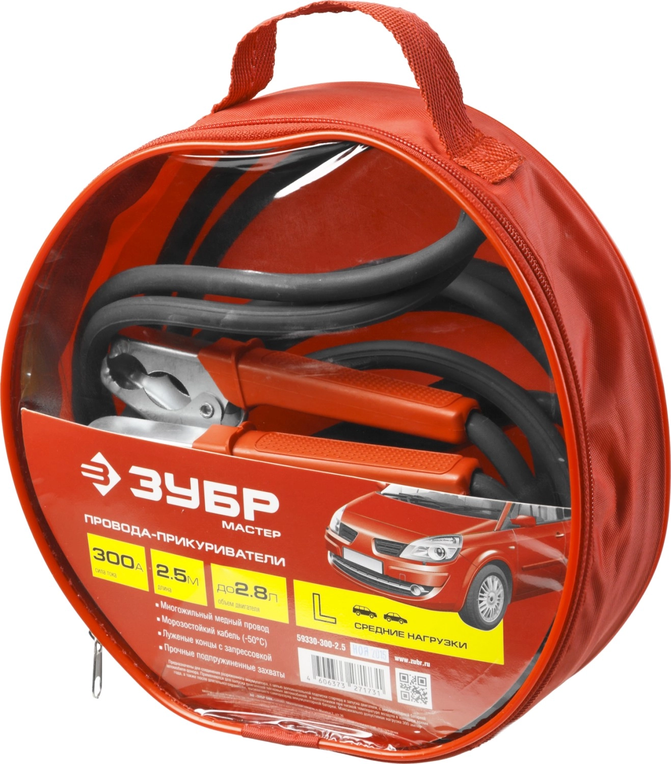 Провода-прикуриватели ЗУБР 59330-300-2.5, предназначены для соединения разряженного аккумулятора, с целью дополнительной подпитки стартера и запуска двигателя, с аккумуляторной батареей автомобиля-донора. Применяются для запуска двигателей легковых автомобилей и мототехники при низкой температуре воздуха в холодное время года, а также после длительного хранения, вызвавшего саморазряд аккумуляторной батареи. МАКСИМАЛЬНО ДОПУСТИМАЯ НАГРУЗКА 300 АМПЕР.Производитель: Крафтул И/Е Гмбх, Альтер Поствег Штр., Лоенинген, Германия
