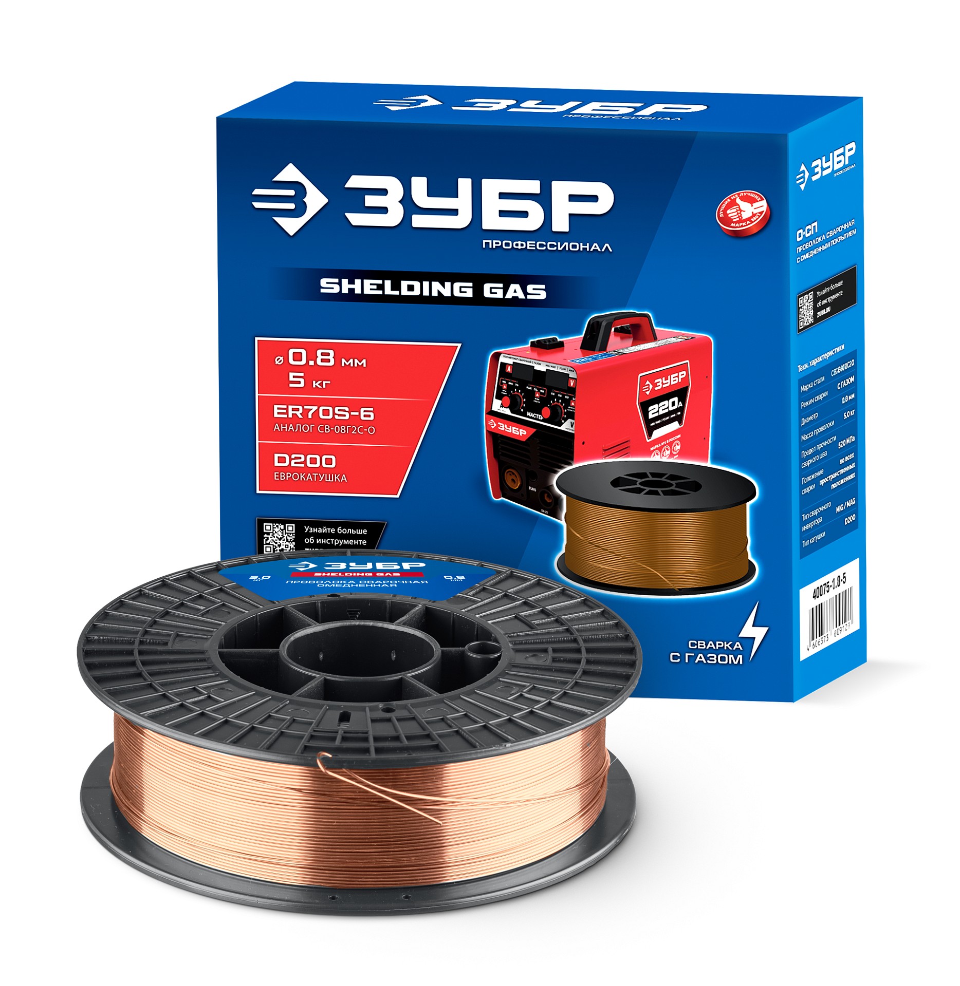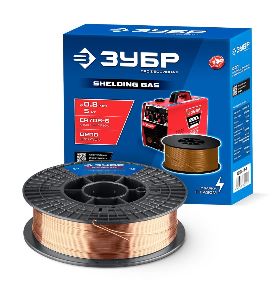 ПроизводителиПроволока сварочная омеднённая О-СП, d 0.8 мм, 5 кг, тип ER70S-6 (40075-0.8-5) ЗУБР