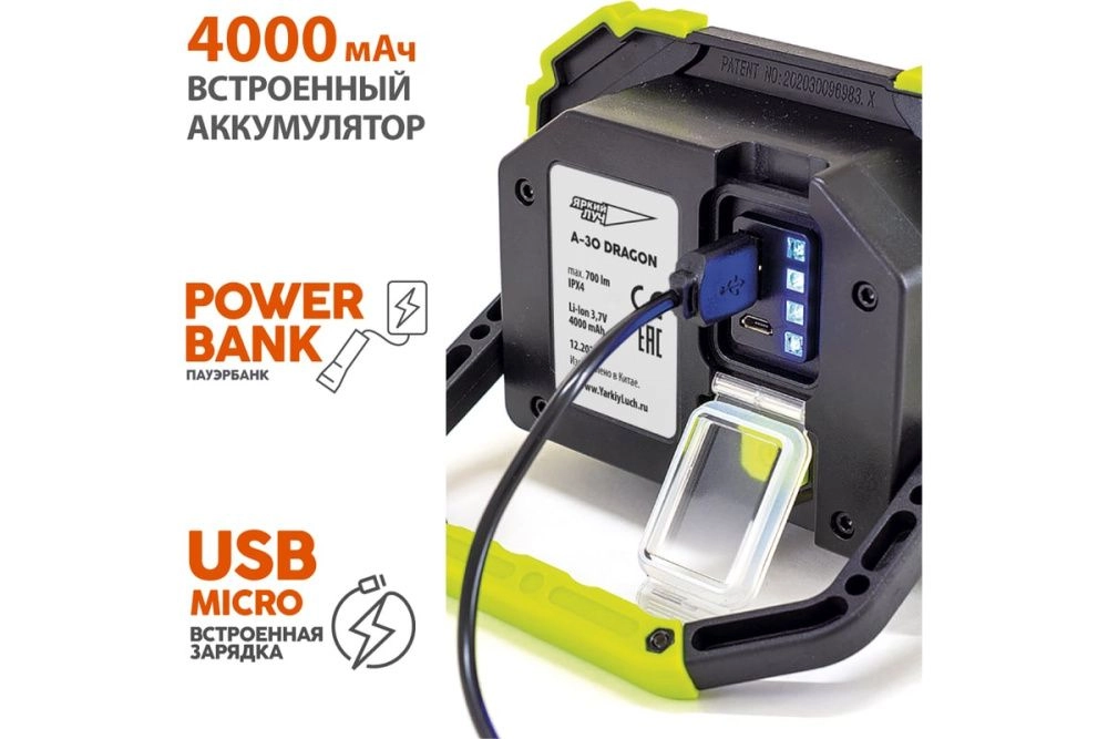 ПроизводителиПрожектор аккум. ЯРКИЙ ЛУЧ "DRAGON" A-30 COB-диод max700лм 3+3реж, IP44, переносной, Li-ion 4000mAh