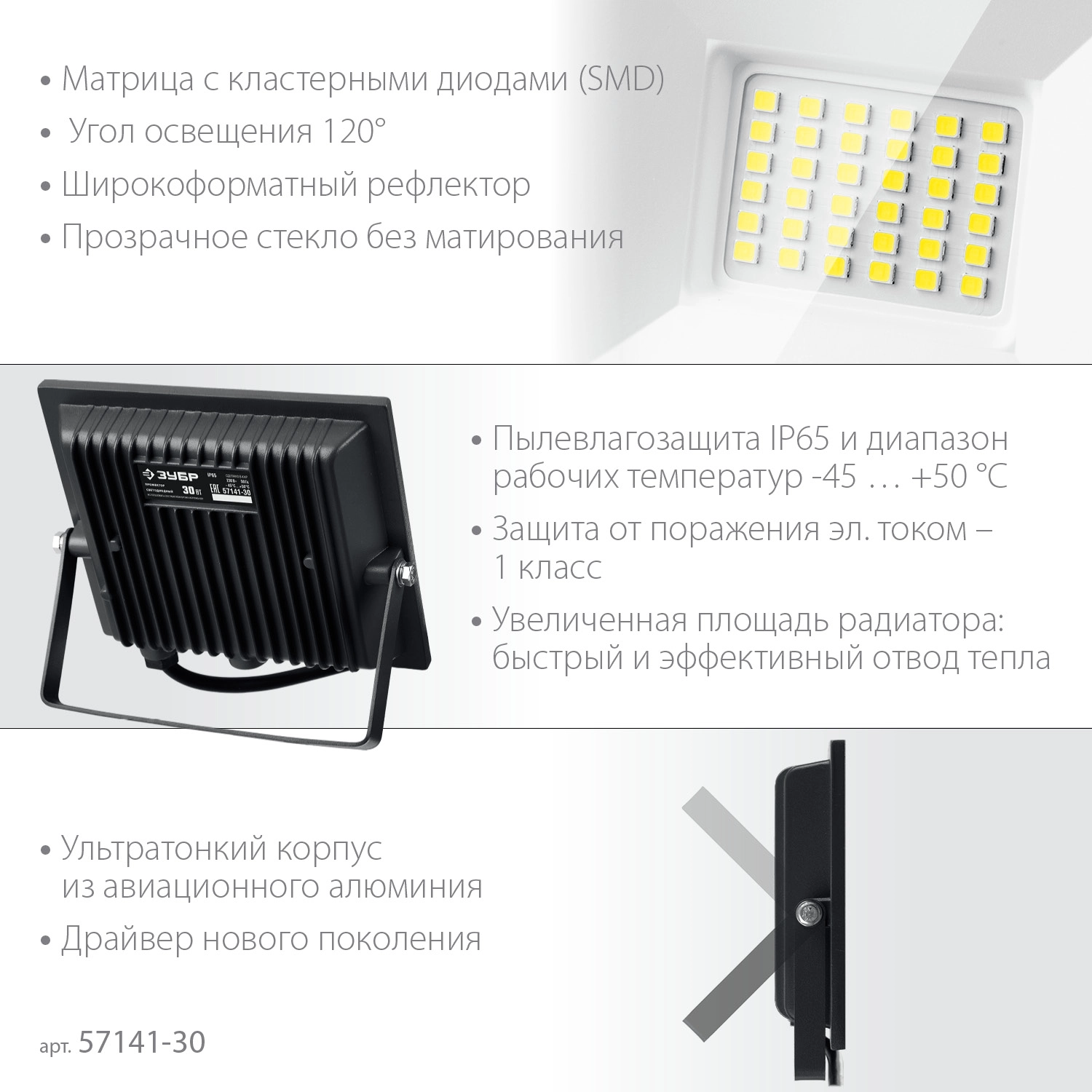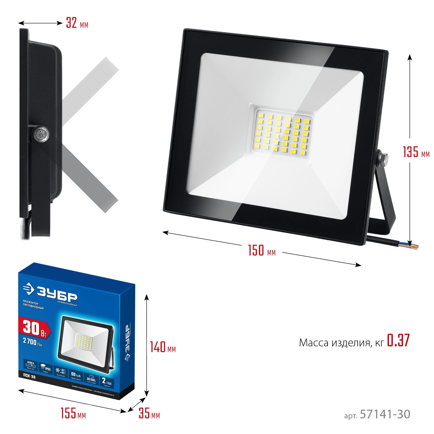 ПроизводителиПрожектор светодиодный 30 Вт, 6500K, IP 65 "Профессионал" (57141-30) ЗУБР