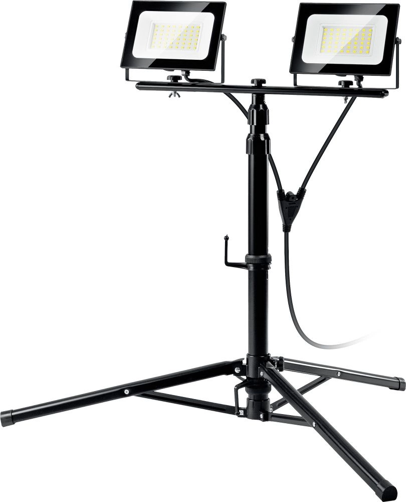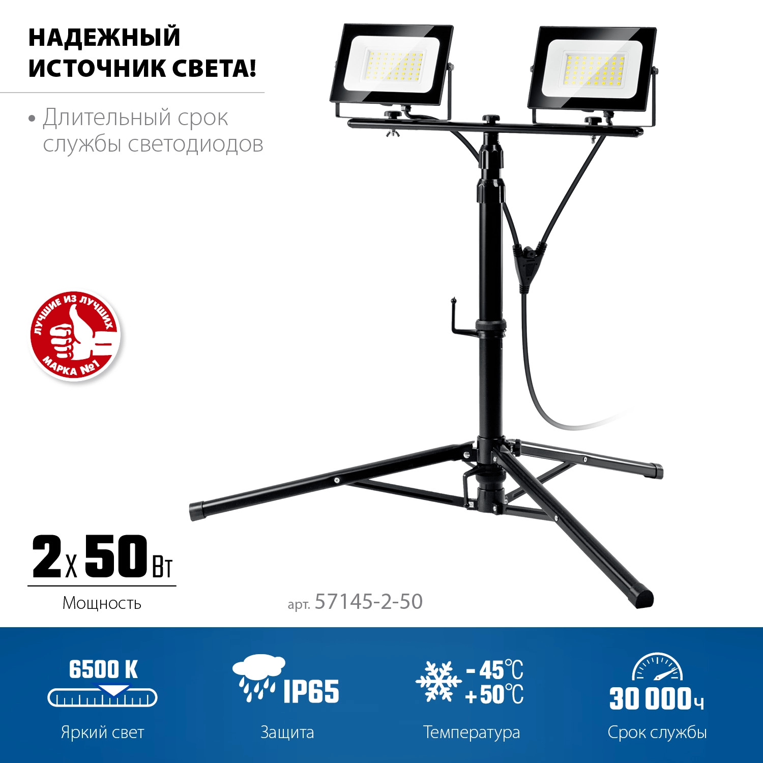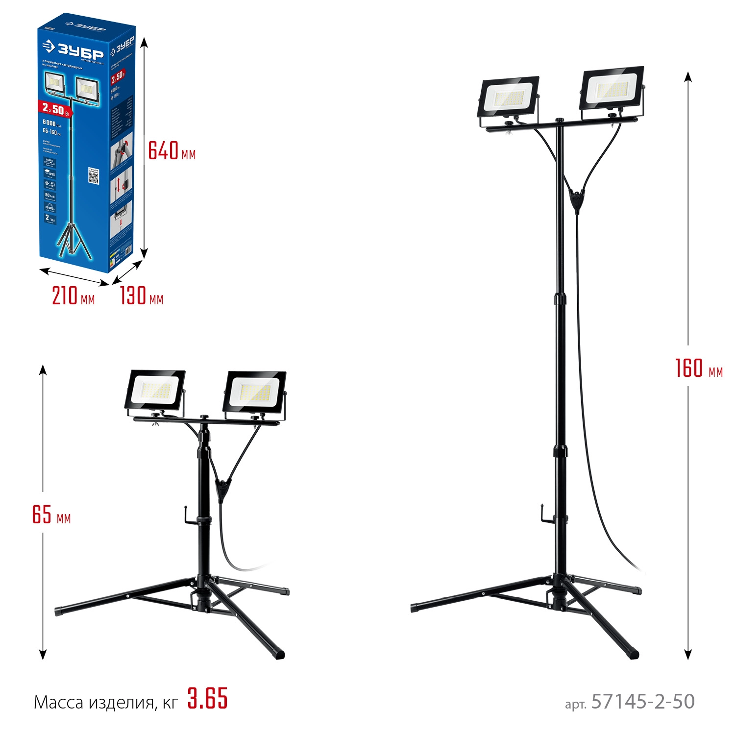 ПроизводителиПрожекторы светодиодные на штативе 2 х 50Вт, 6500К IP65, 1.6 м (57145-2-50) ЗУБР