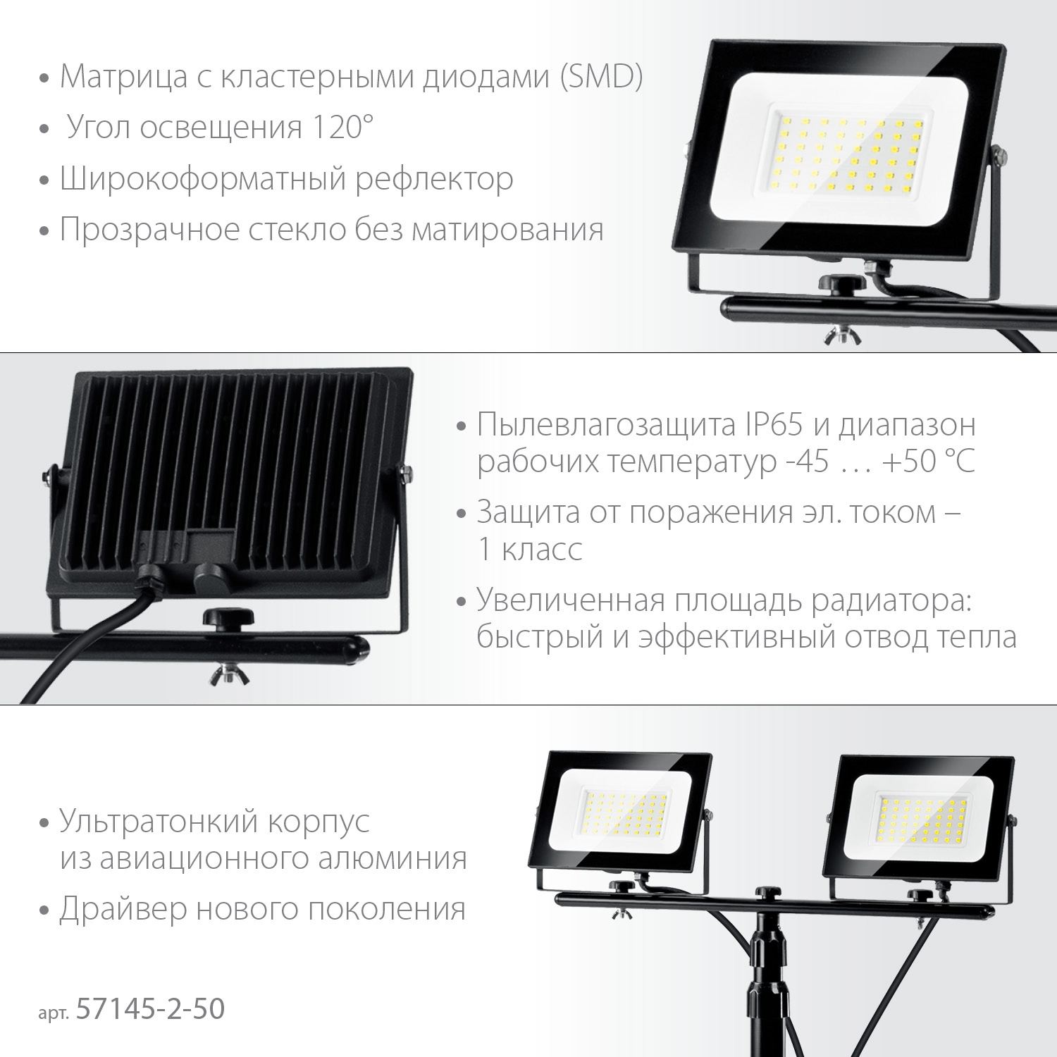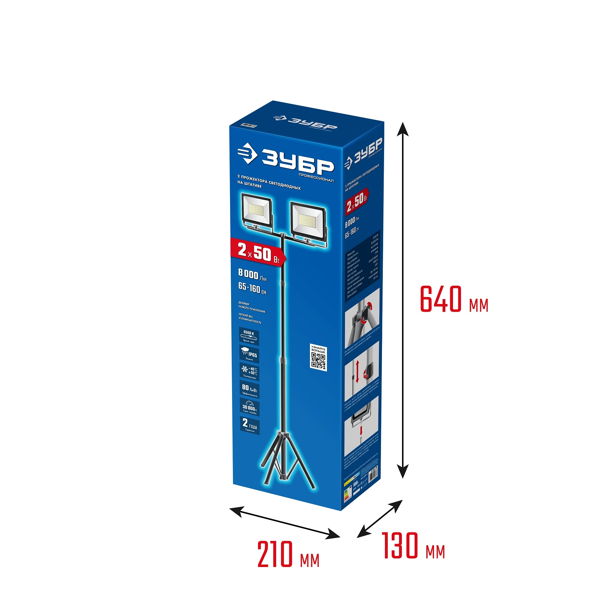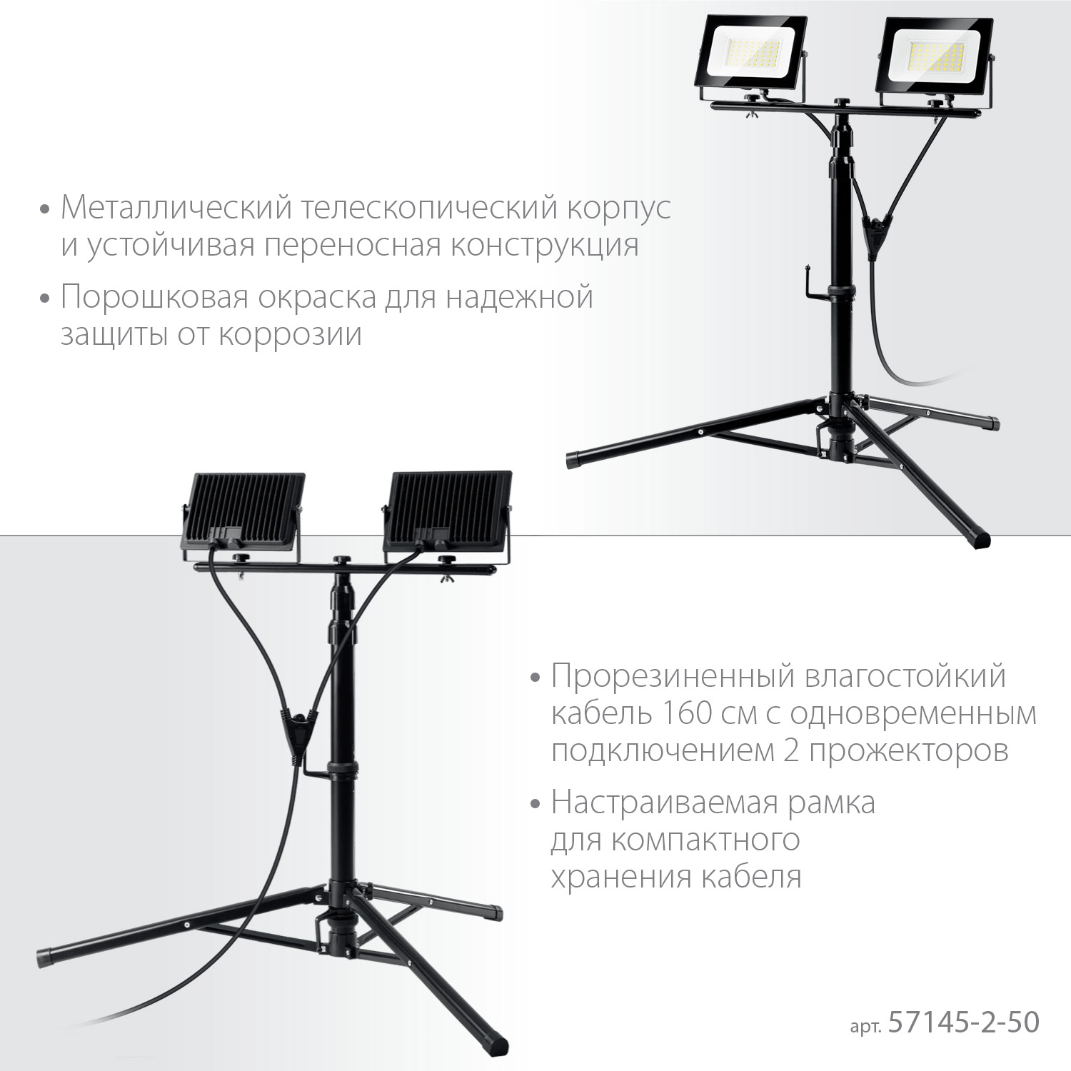 ПроизводителиПрожекторы светодиодные на штативе 2 х 50Вт, 6500К IP65, 1.6 м (57145-2-50) ЗУБР