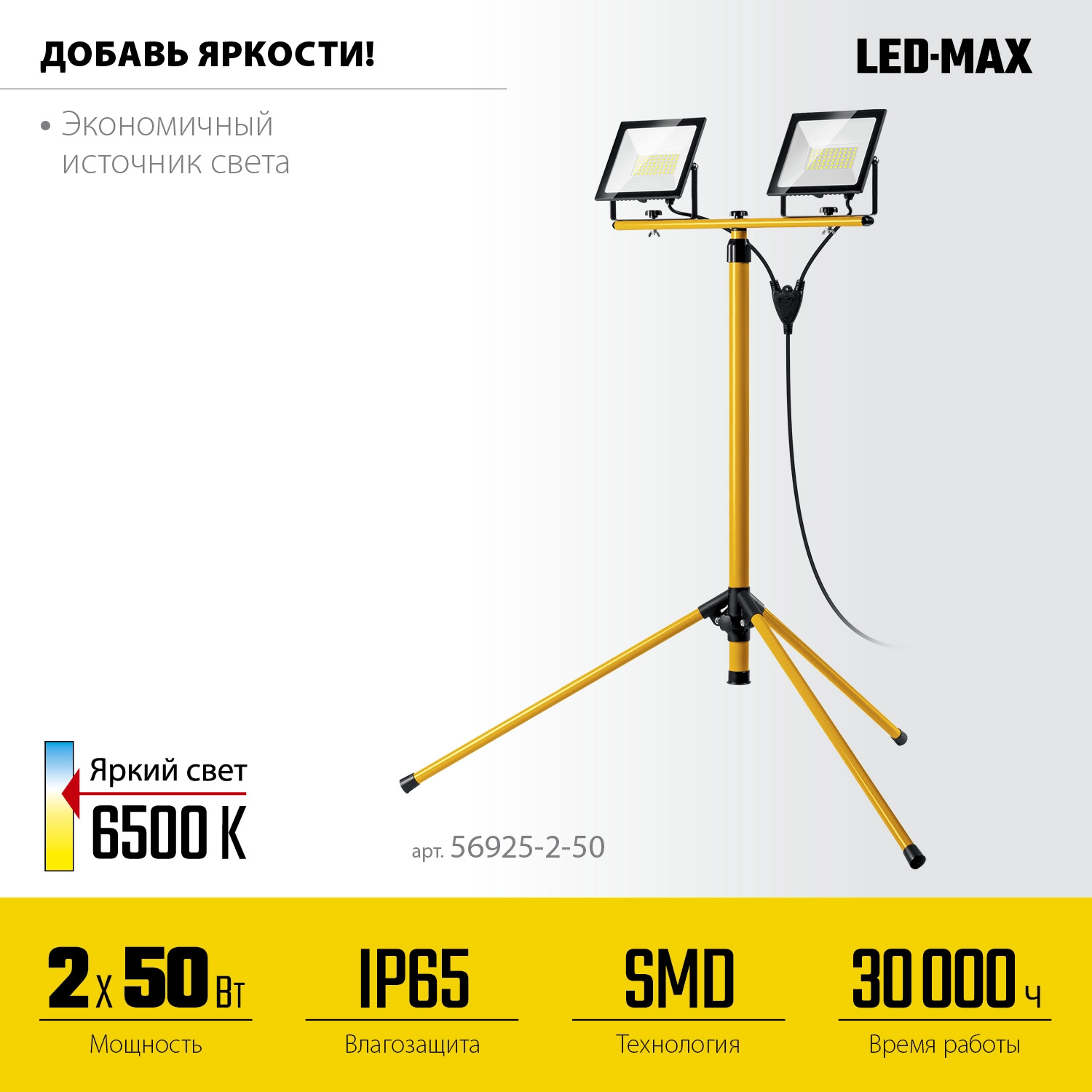 ПроизводителиПрожекторы светодиодные на штативе 2х50Вт, 6500К, IP65, 1.6 м (56925-2-50) STAYER