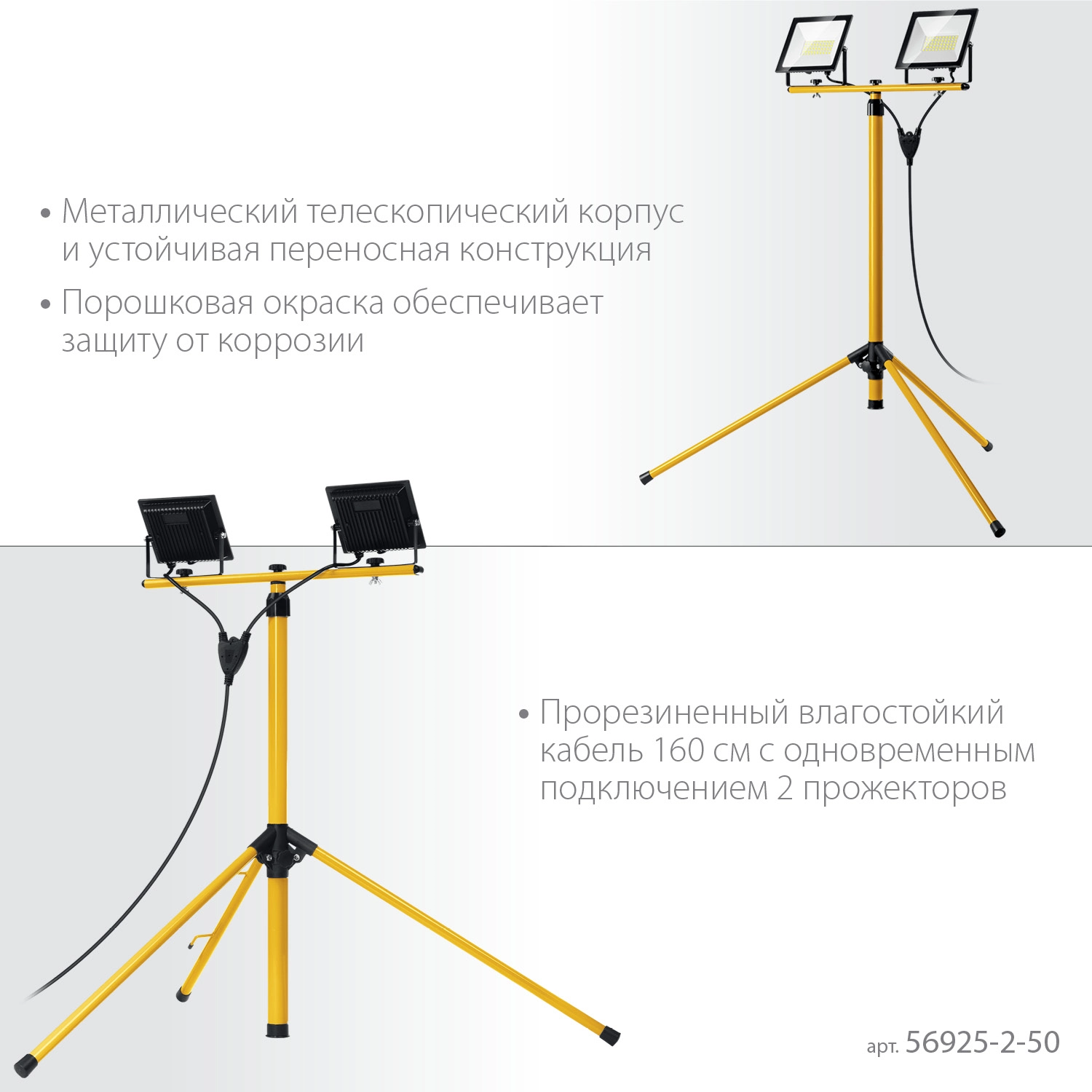 Прожекторы STAYER на штативе - осветительный прибор, состоящий из прочной и устойчивой треноги с двумя прожекторами на основе ярких, высокоэффективных и долговечных источников света. Корпус прожекторов выполнен из алюминиевого сплава литого под давлением, обеспечивающего высокую теплоопередачю. Конструкция прожектора защищена от пыли и влаги (IP65).