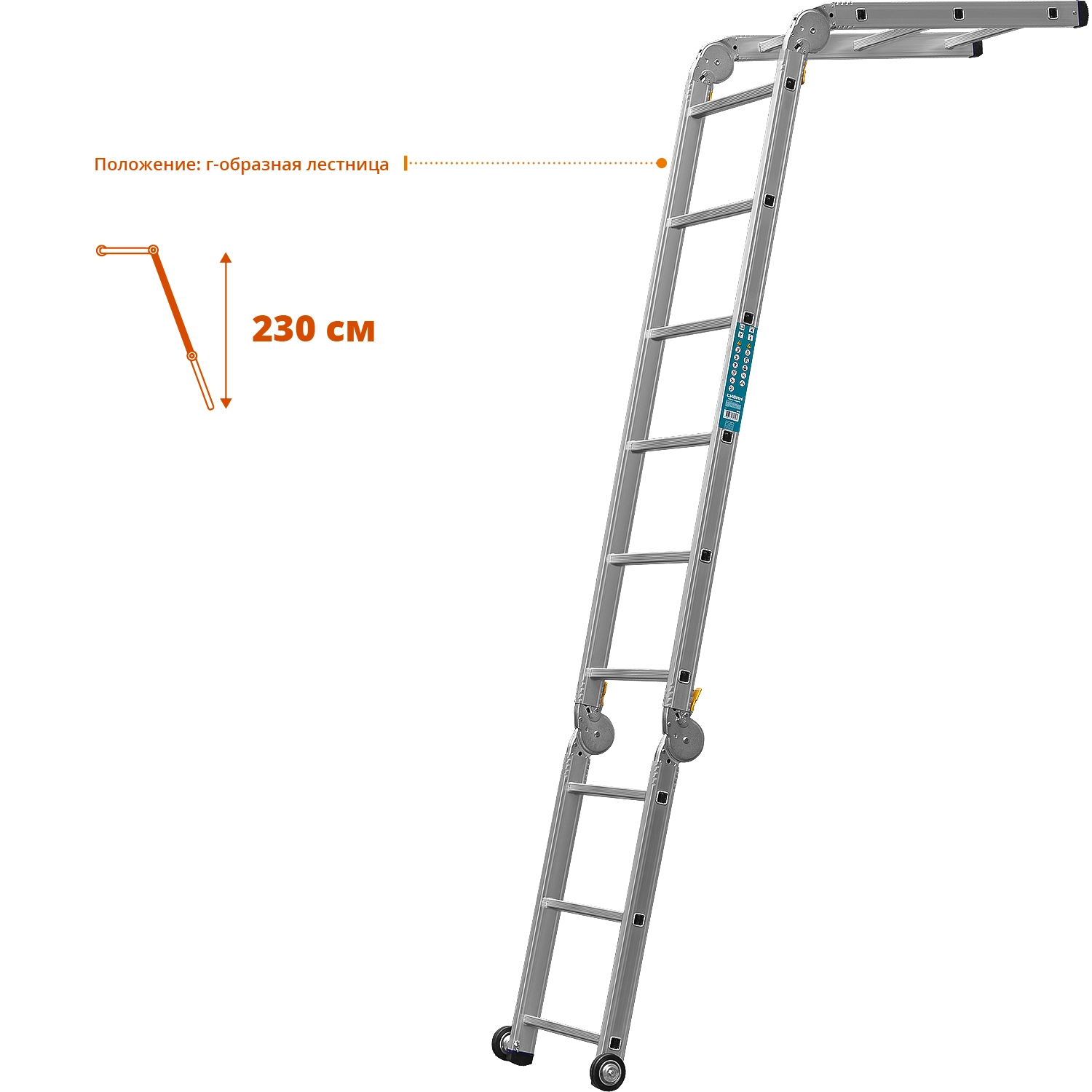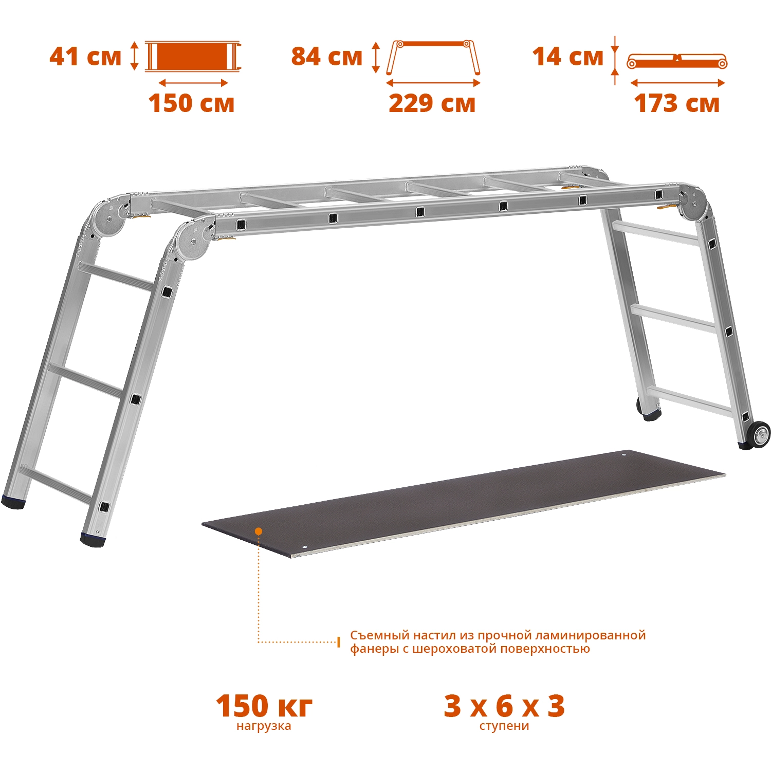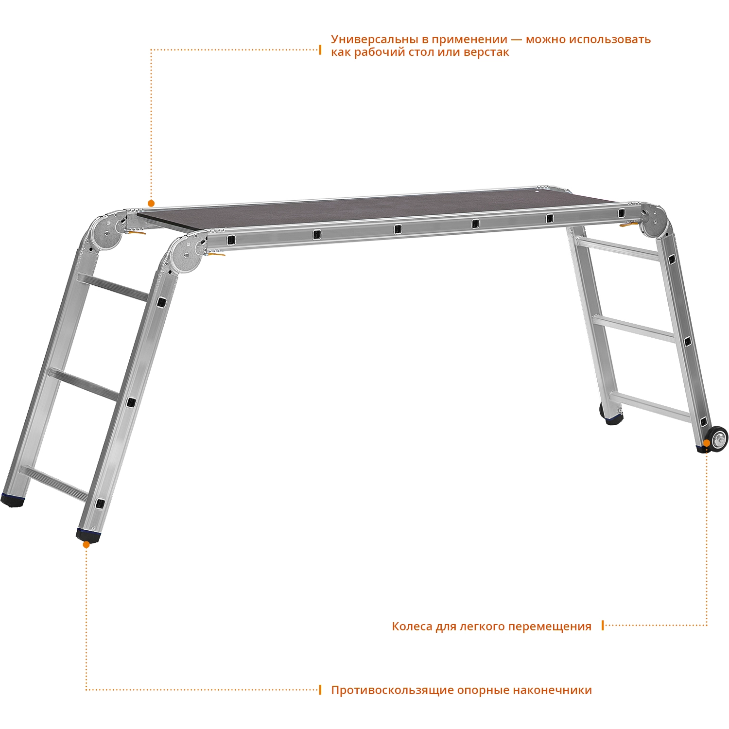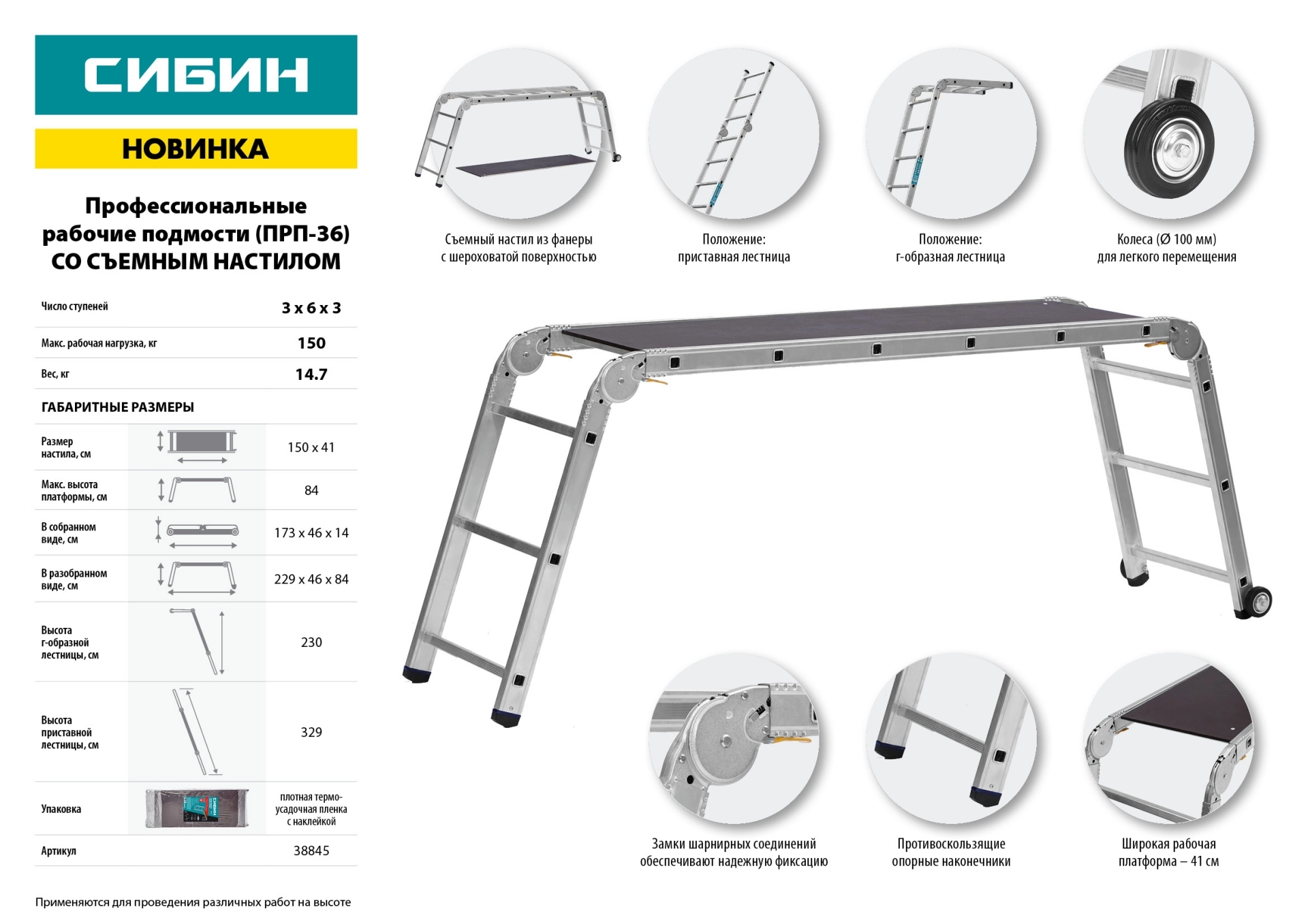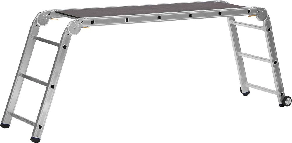 Рабочие подмости СИБИН 38845, предназначены для выполнения различных хозяйственных работ. Широкая рабочая платформа. Могут использоваться как приставная или Г-образная лестница. Колеса обеспечивают простоту перемещения. Прочная и легкая конструкция. Замки шарнирных соединений обеспечивают надежную фиксацию. Противоскользящие опорные наконечники.