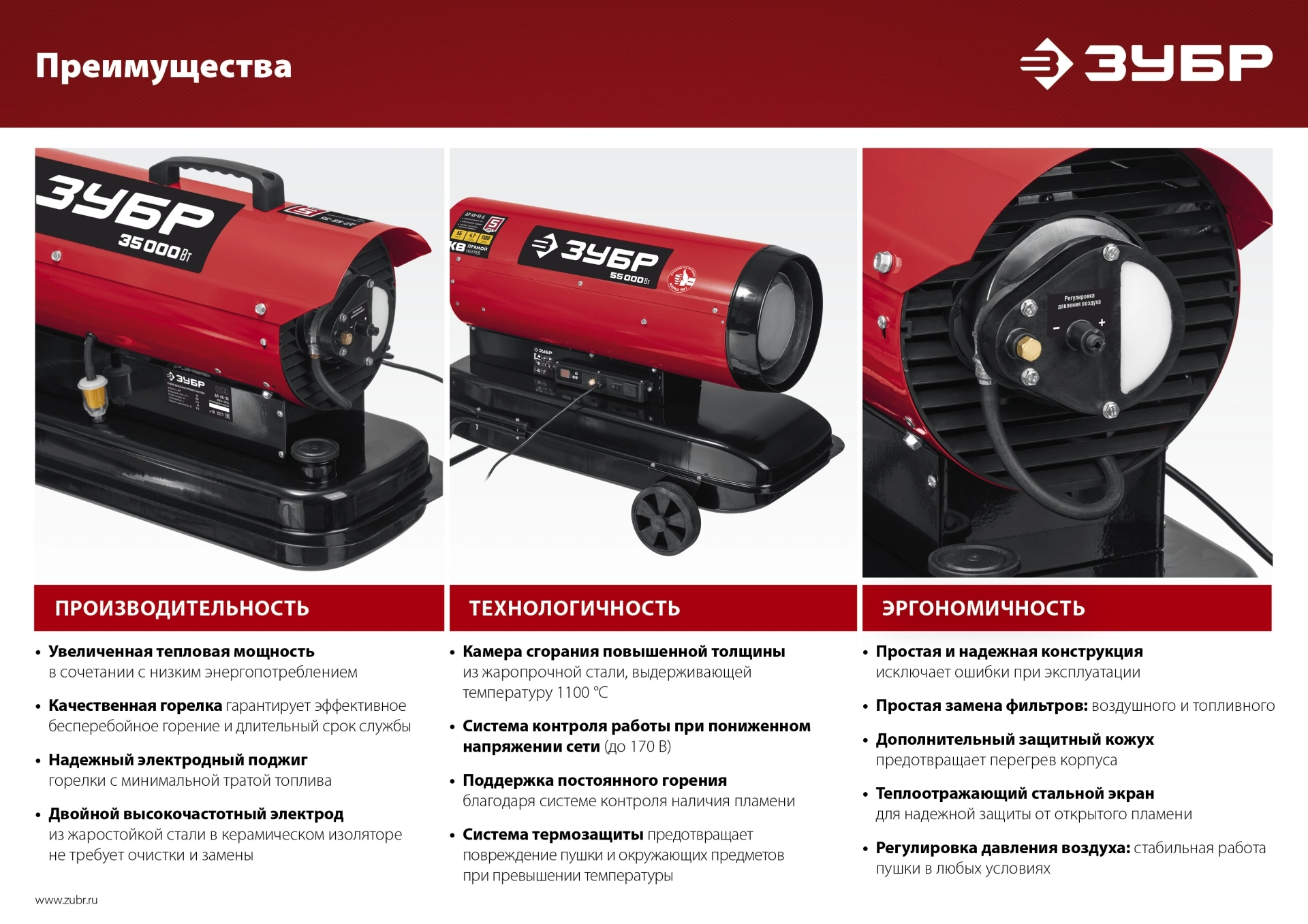 Высокоэффективный дизельный теплогенератор прямого нагрева работающий на дизельном топливе для всех климатических условий. Оптимально подходит для сушки и прогрева на строительных площадках складских комплексов и проветриваемых помещений. Надежный поджиг и эффективное горение гарантируют безотказную подачу тепла в любых условиях эксплуатации. ЗУБР - тепло всегда и везде