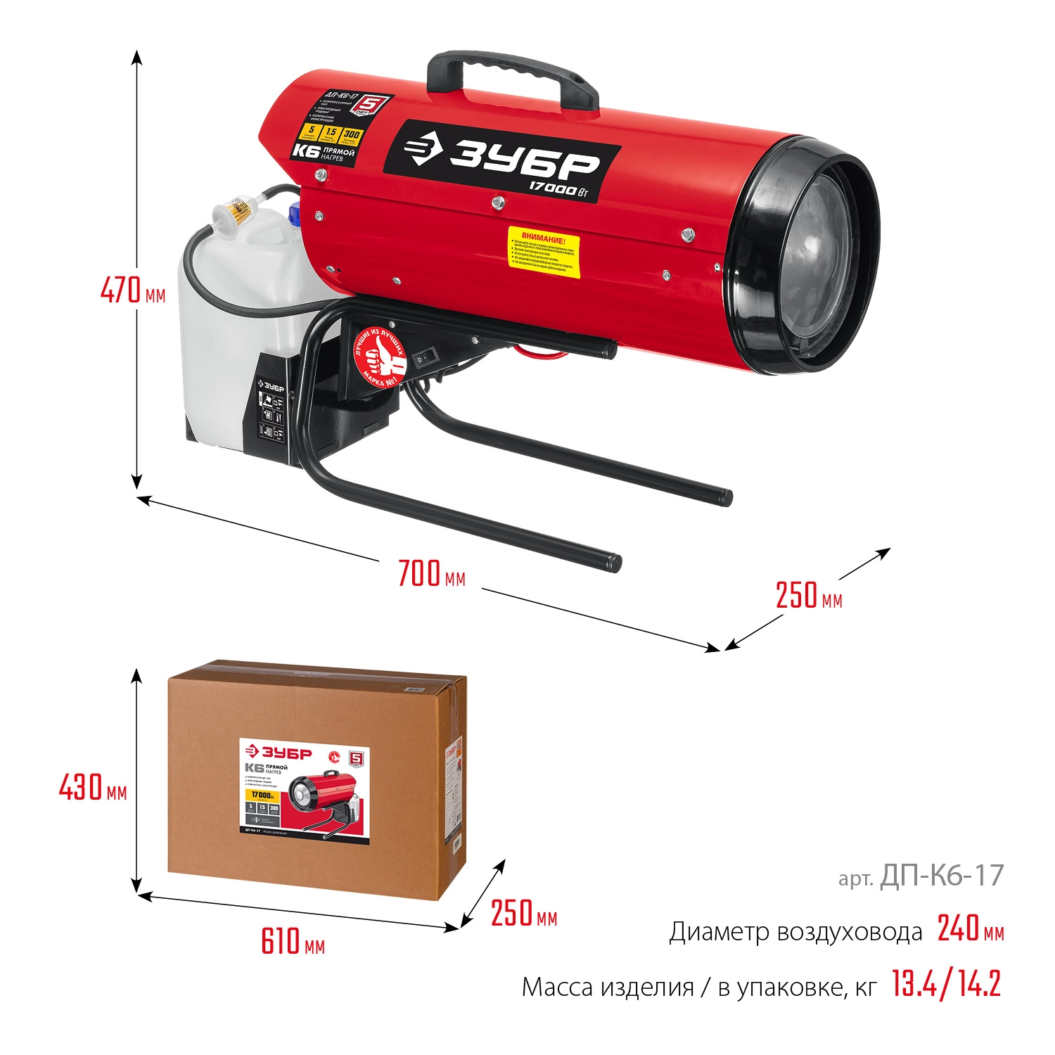 ПРОФИУровень качества. При классификации продуктов, имеющих схожее наименование, но обладающие различными потребительскими свойствами мы приняли следующий Вес факторов: 80% - подтвержденный ресурс, 15% - заявленная производительность/скорость, 5% - субъективные ощущения потребителя. ПодробнееКод товара: 0051536(0)ХарактеристикиАртикул ДП-К6-17Бренды ЗубрСтрана производства КитайМощность, кВТ 17Напряжение сети 220-240Преимущества Пушки тепловой дизельной ДП-К6-17 ЗУБР