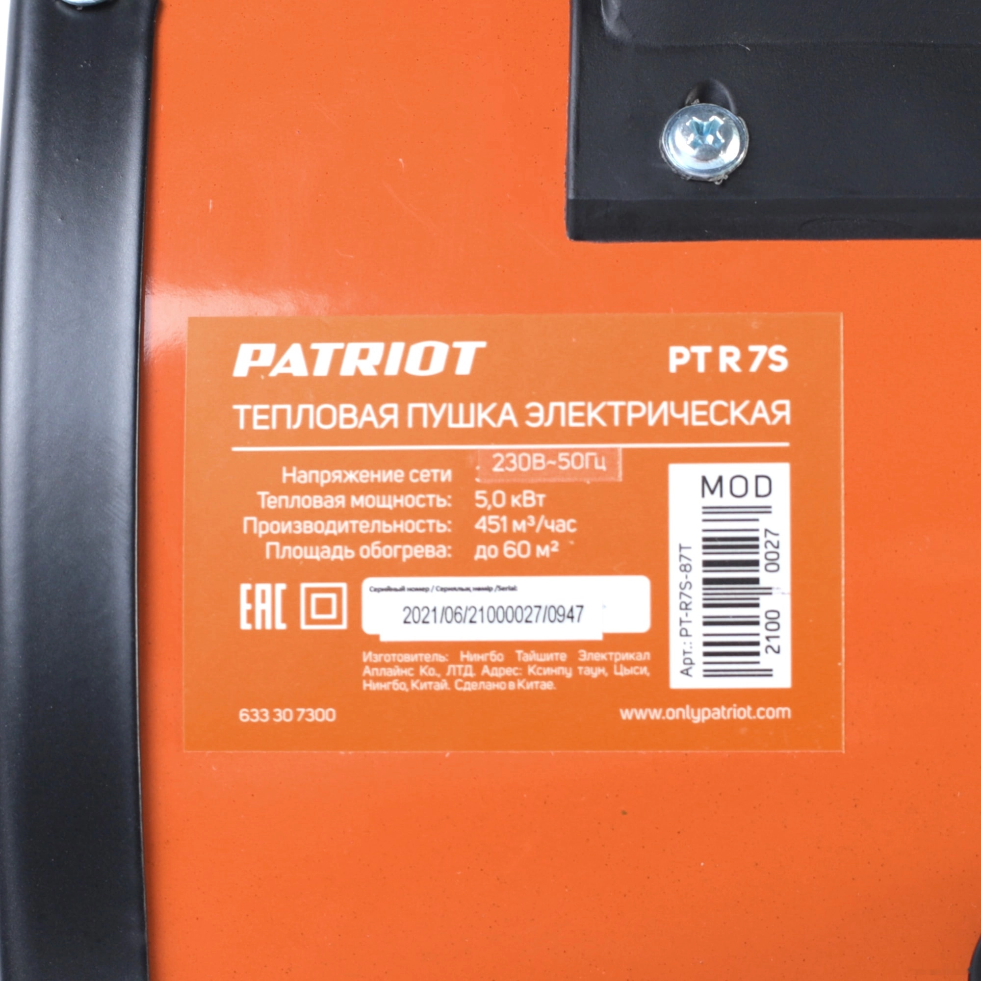 ПроизводителиПушка тепловая электрическая PTR 7S (5 кВт 320 м3/ч 50м2 230В круглая) PATRIOT / IMPERIAL