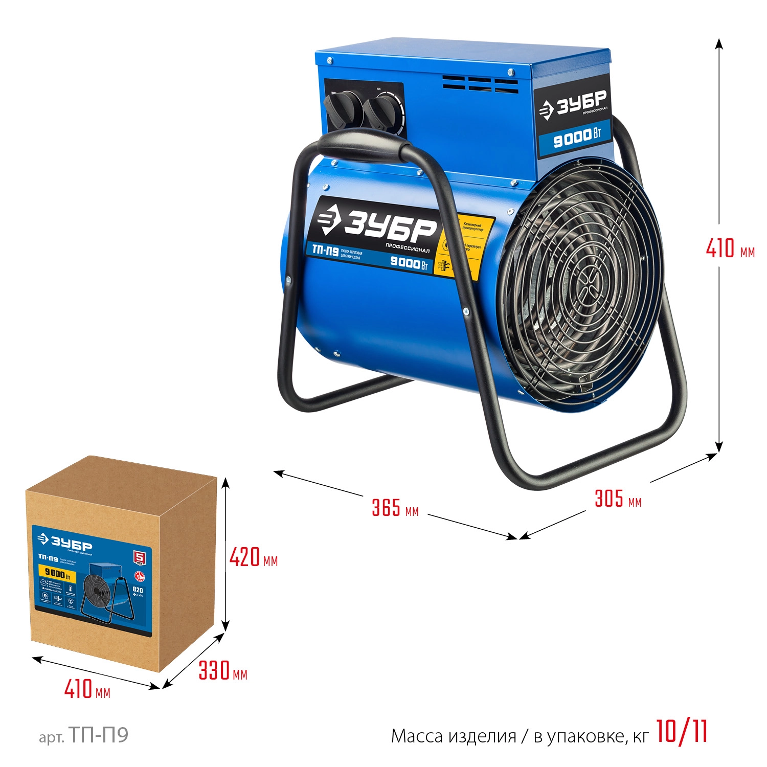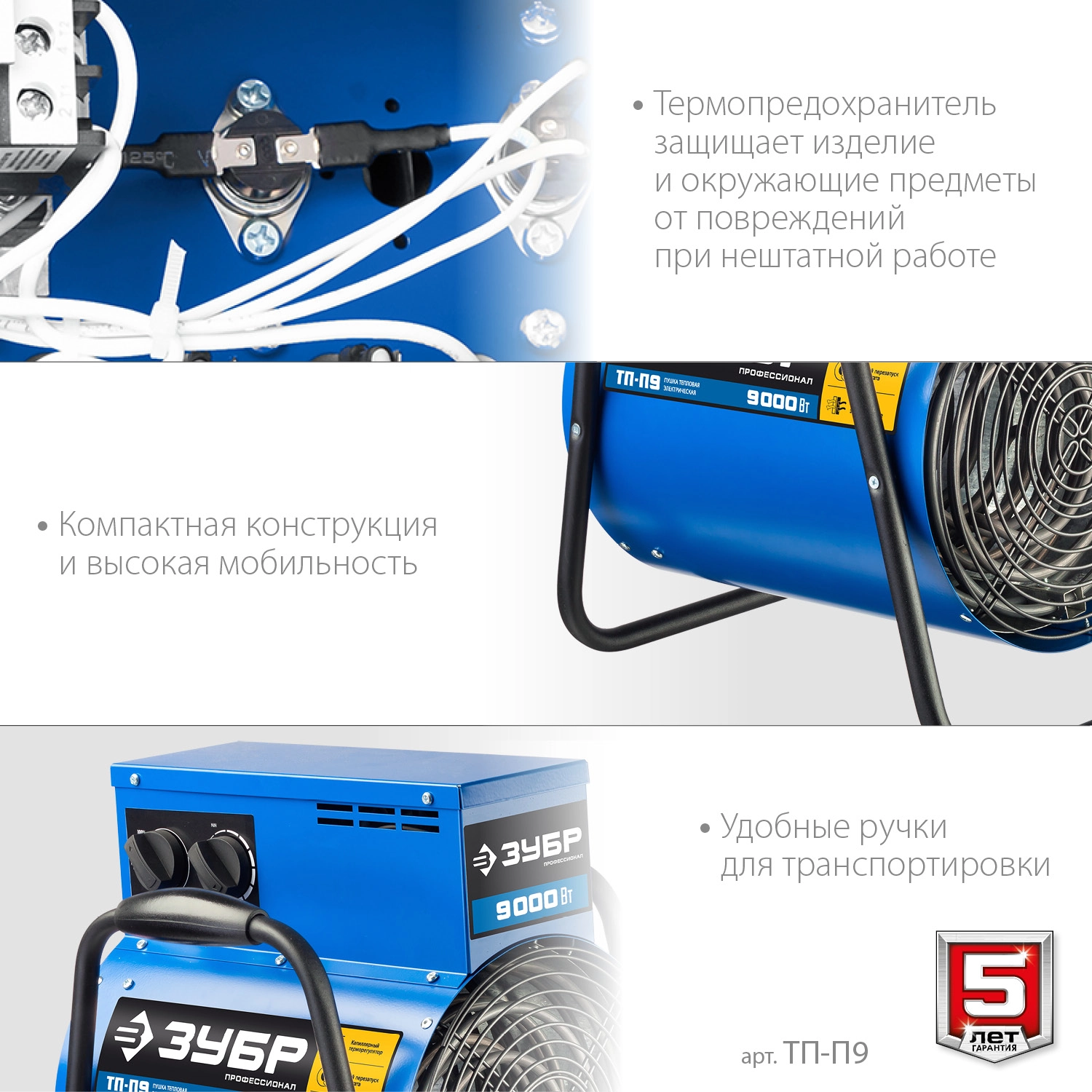 ПроизводителиПушка тепловая электрическая ТП-П9 "Профессионал" (9 кВт, 820 м3/ч, 380 В) ЗУБР