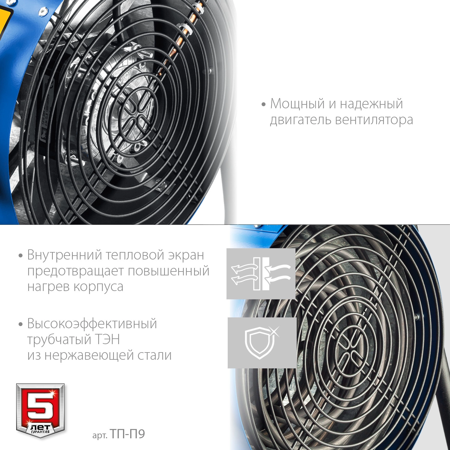 ПРОФИУровень качества. При классификации продуктов, имеющих схожее наименование, но обладающие различными потребительскими свойствами мы приняли следующий Вес факторов: 80% - подтвержденный ресурс, 15% - заявленная производительность/скорость, 5% - субъективные ощущения потребителя. ПодробнееКод товара: 0063932(0)ХарактеристикиАртикул ТП-П9Бренды ЗубрСтрана производства РоссияМощность, кВТ 9Напряжение сети 380Профессиональные электрические тепловые пушки с питанием от трехфазной электрической сети эффективны для быстрого и направленного обогрева складских и производственных помещений, ангаров и мастерских, благодаря большой площади нагревательных элементов и мощным двигателем вентилятора. Надёжная доработанная конструкци,обеспечивают защиту как пользователя, так и тепловой пушки в случае возникновения нештатных ситуаций. ЗУБР - тепло всегда и везде
