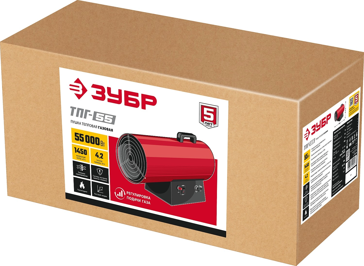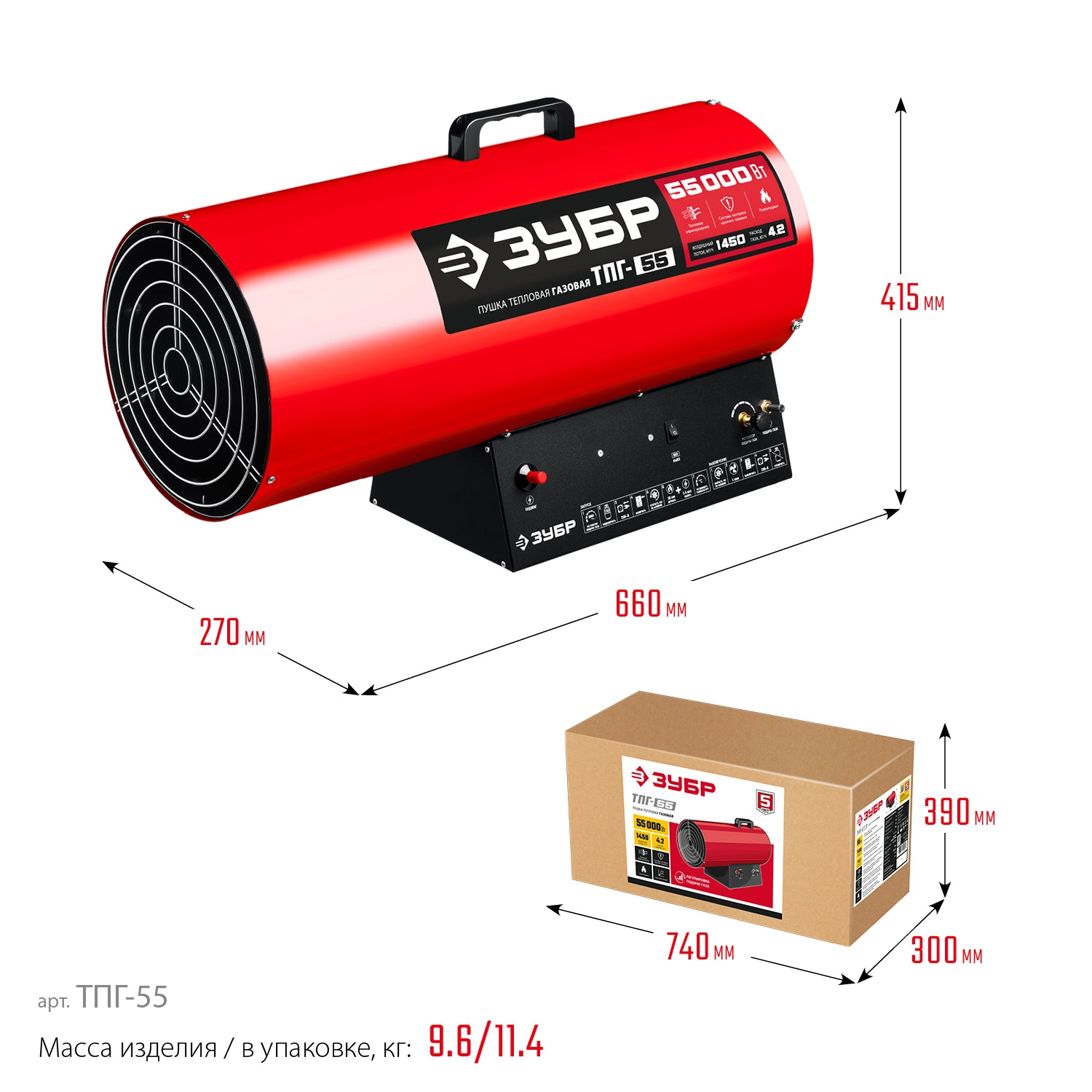 ХарактеристикиАртикул ТПГ-55Бренды ЗубрСтрана производства КитайПроизводительность 1450Вес 9.6Расход топлива 8.4Длина 66Ширина 41.5Высота 27Описание товара обновлено 08.12.2025 15:42:43Высокоэффективный газовый обогреватель, работающий на наиболее распространенном виде топлива. Оптимально подходит для использования на открытых и полузакрытых площадках для просушки и обогрева, размораживания траншей и аварийного прогрева помещений, а так же для монтажа натяжных потолков. Надежный поджиг дуги и эффективное горение гарантируют безотказную подачу тепла в любых условиях эксплуатации.