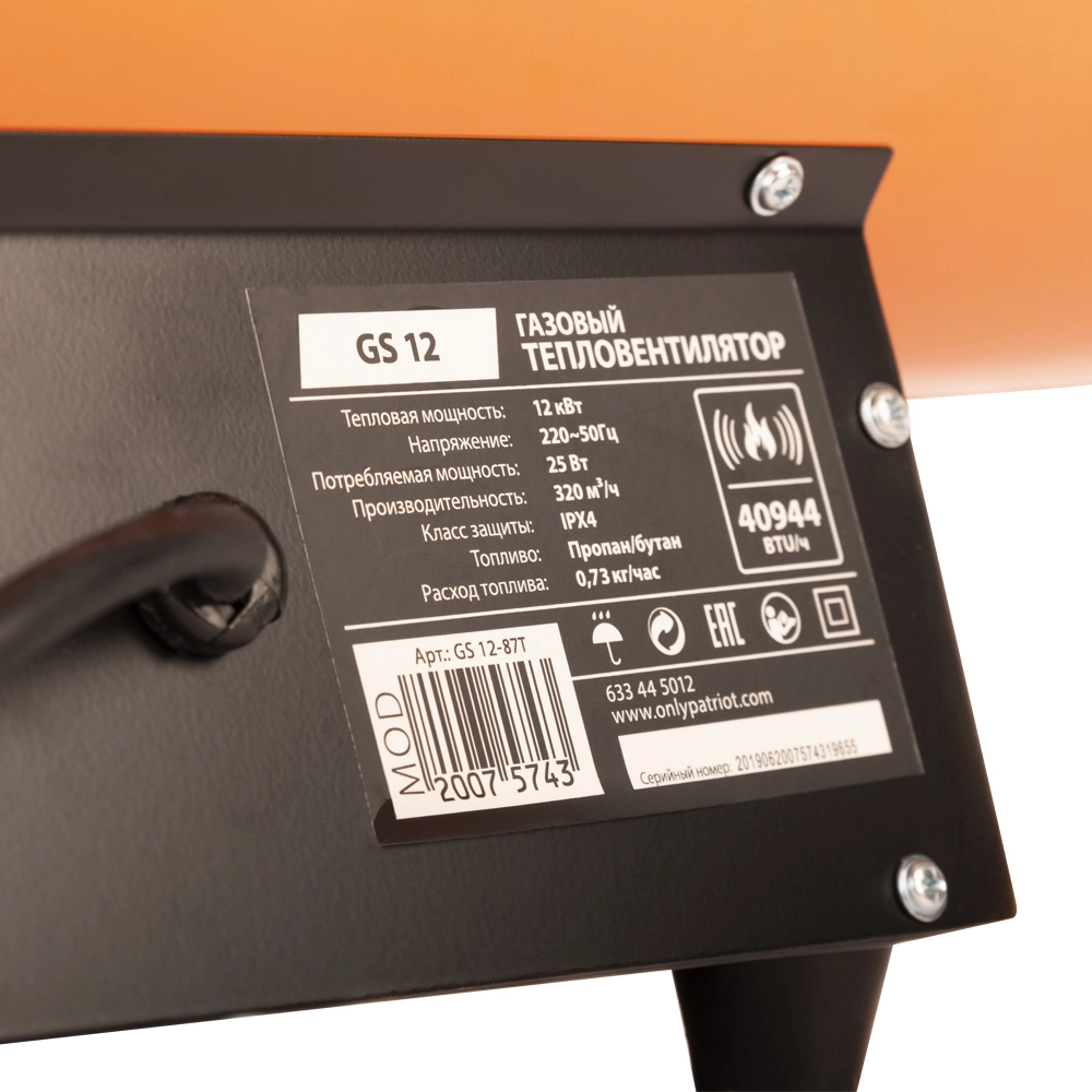 ПроизводителиПушка тепловая газовая GS 12 (12 кВт 320 м3/ч 0,71кг/ч 360 м2 220В) PATRIOT / IMPERIAL
