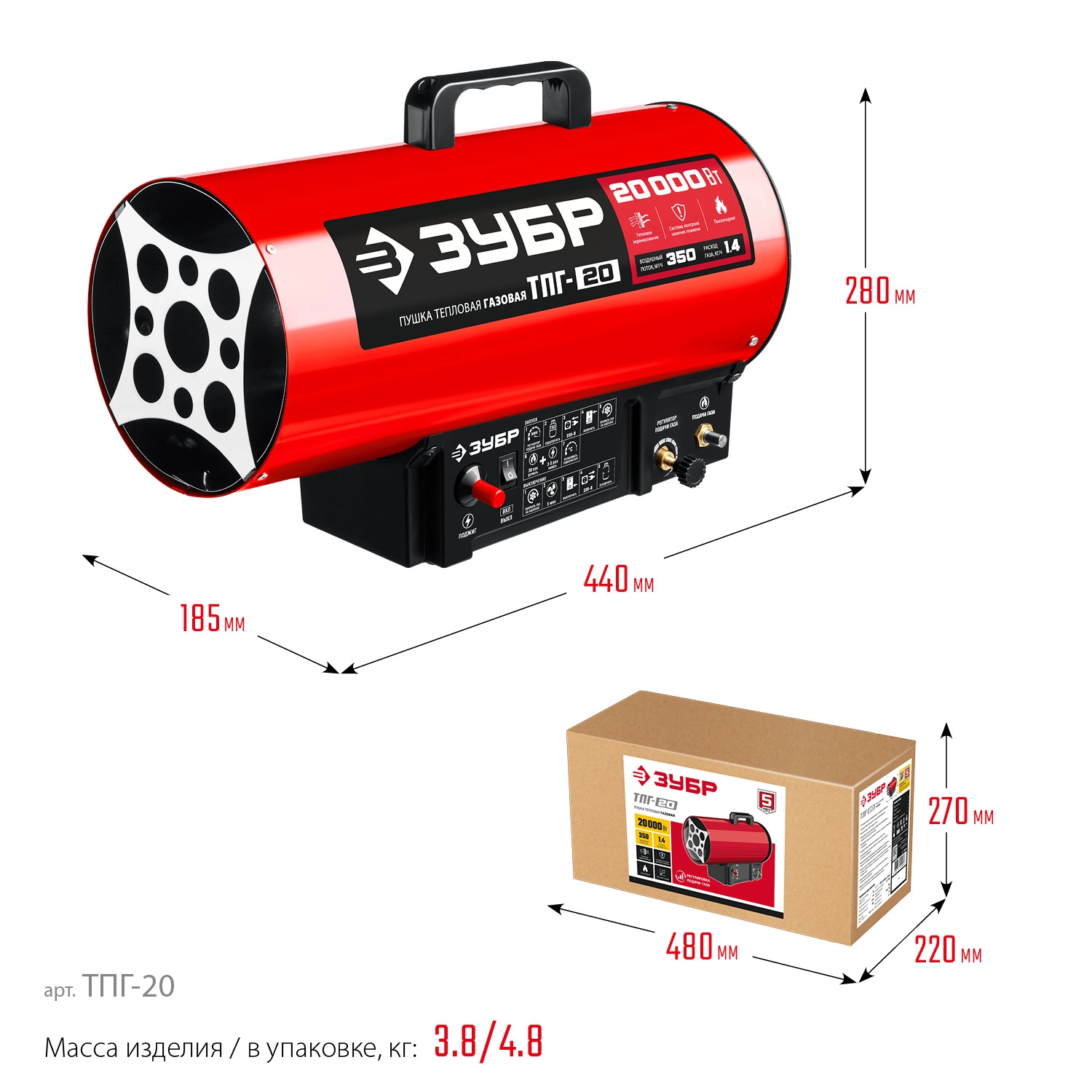 СТАНДАРТУровень качества. При классификации продуктов, имеющих схожее наименование, но обладающие различными потребительскими свойствами мы приняли следующий Вес факторов: 80% - подтвержденный ресурс, 15% - заявленная производительность/скорость, 5% - субъективные ощущения потребителя. ПодробнееКод товара: 0064226(0)ХарактеристикиАртикул ТПГ-20Бренды ЗубрСтрана производства РоссияМощность, кВТ 20Напряжение сети 220-240Высокоэффективный газовый обогреватель, работающий на наиболее распространенном виде топлива. Оптимально подходит для использования на открытых и полузакрытых площадках для просушки и обогрева, размораживания траншей и аварийного прогрева помещений, а так же для монтажа натяжных потолков. Надежный поджиг дуги и эффективное горение гарантируют безотказную подачу тепла в любых условиях эксплуатации. ЗУБР - тепло всегда и вездеПроизводитель: Крафтул И/Е Гмбх, Альтер Поствег Штр., Лоенинген, Германия
