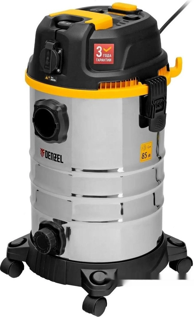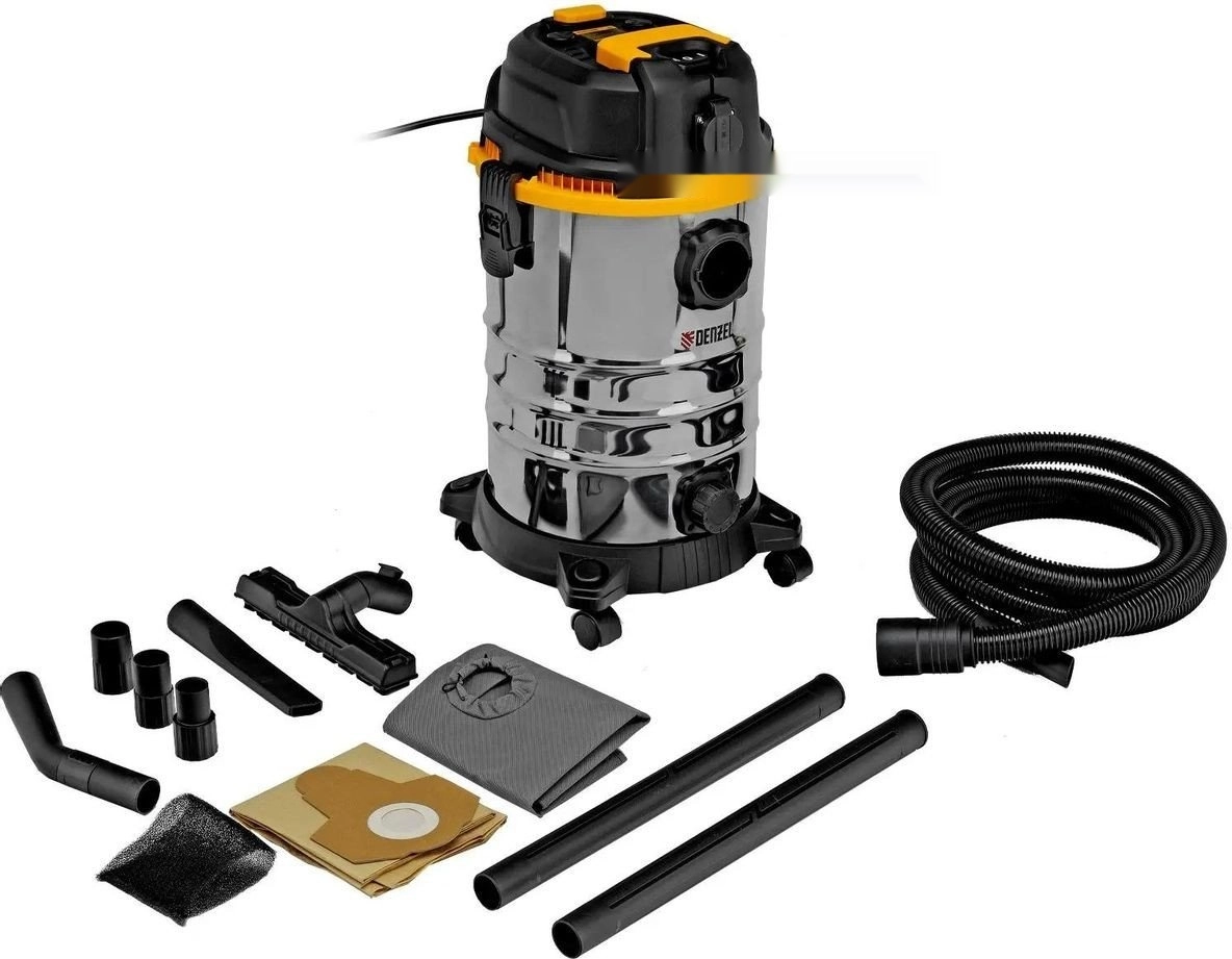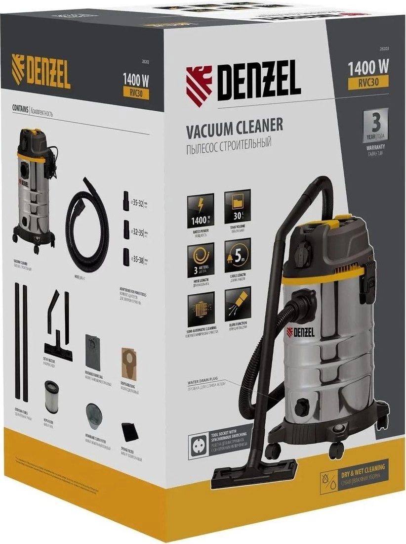 ПроизводителиПылесос строительный RVC30 (1400 Вт, объем 30 л, шланг 3 м, сухая и влажная уборка) DENZEL