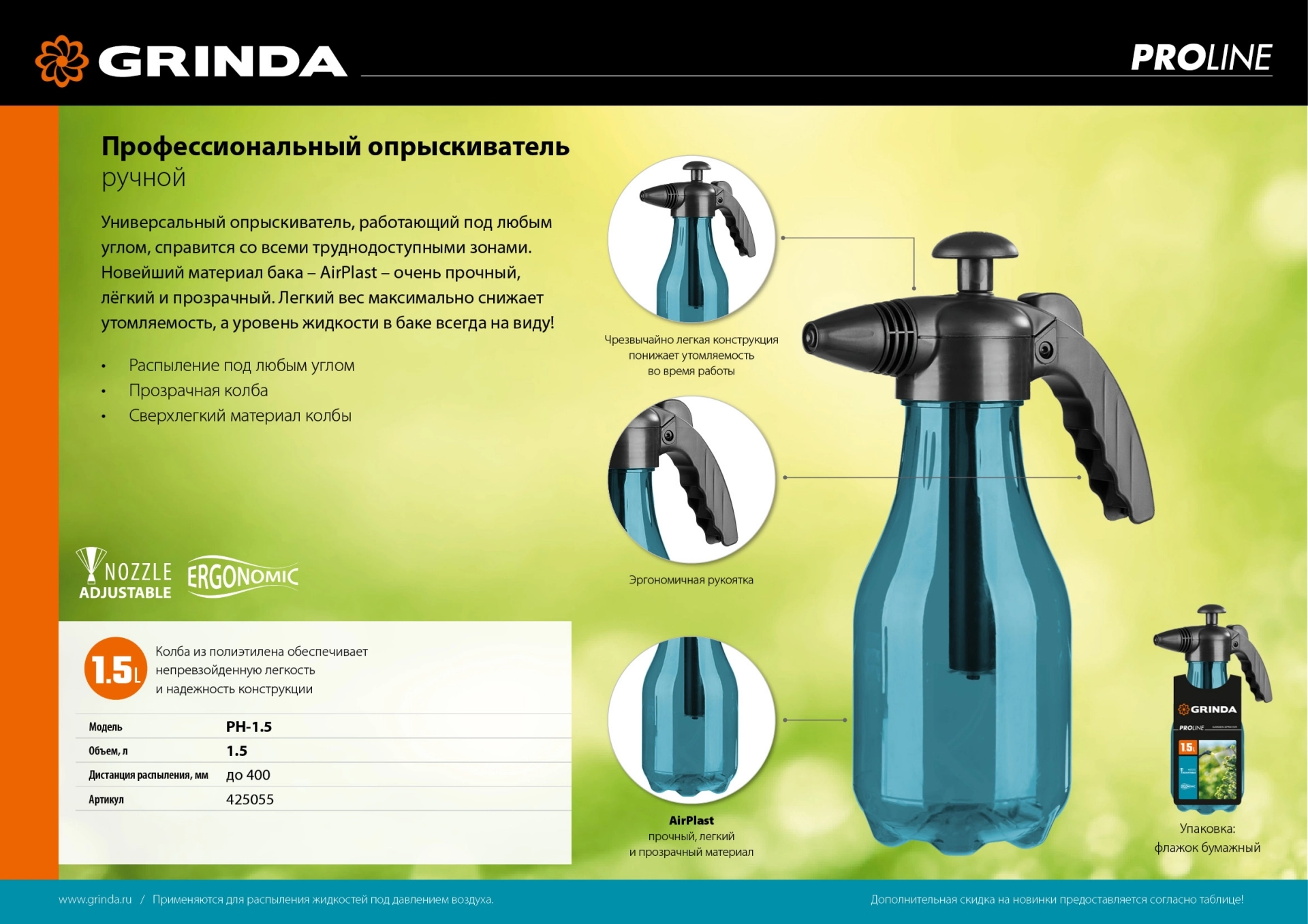 ПроизводителиРаспылитель ручной, работа под любым углом, 1500мл (425055_z01) GRINDA