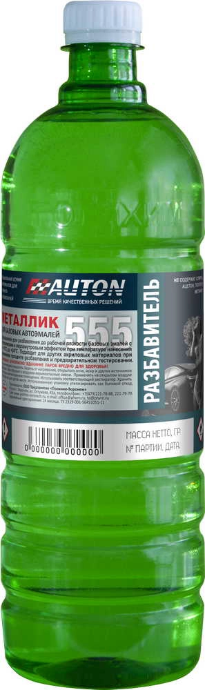 ПроизводителиРазбавитель 555 для базовых автоэмалей типа "металлик" * 1л 800 гр ПЭТ тара (ATN-S07409) AUTON