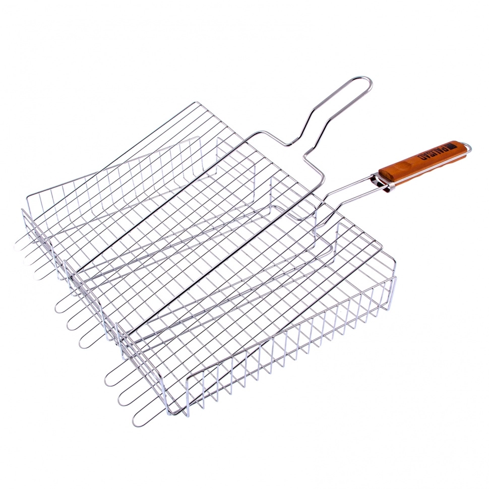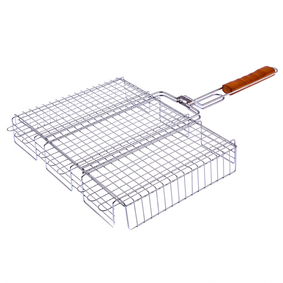 Объемная хромированная решетка гриль Palisad Camping 69562 размером 315 х 410 х 70 мм позволяет легко жарить пищу с двух сторон в мангале.
