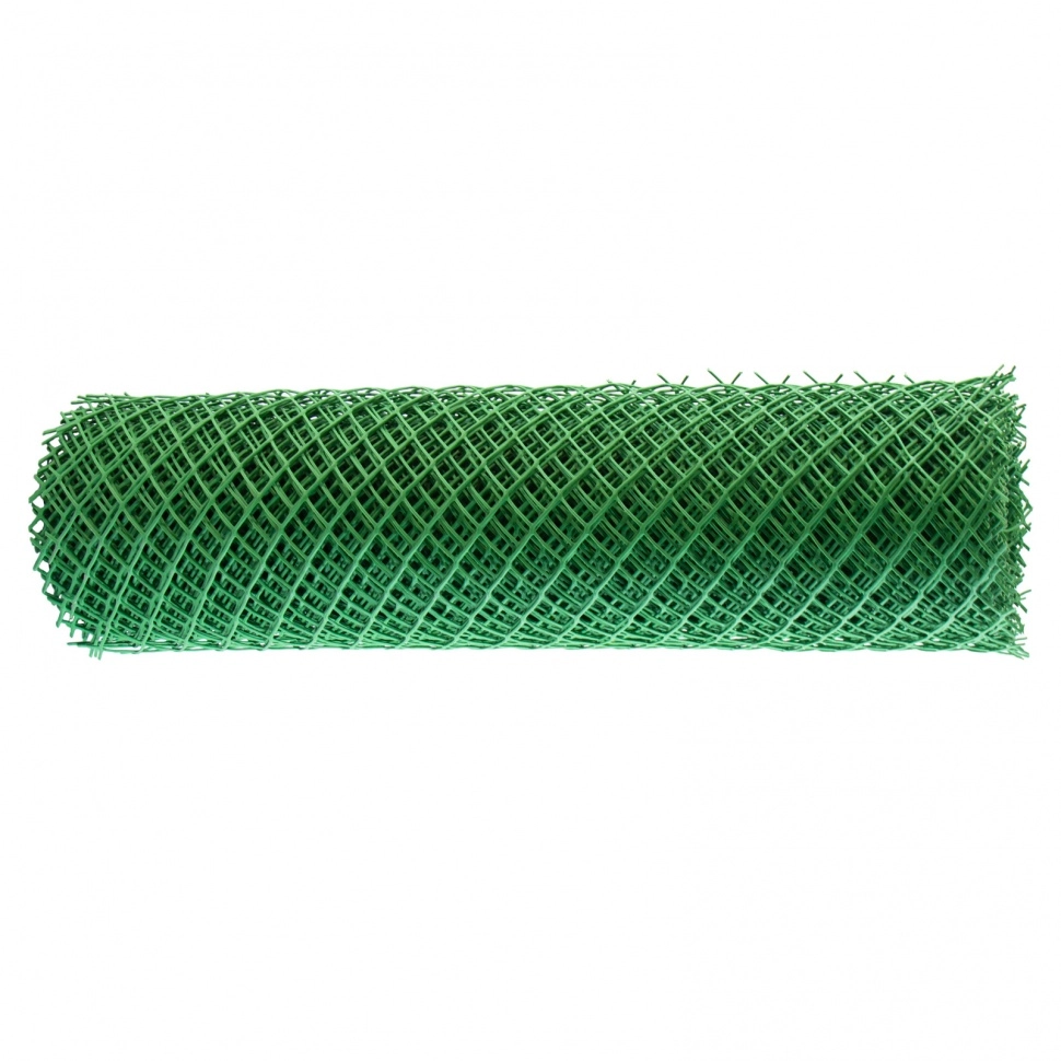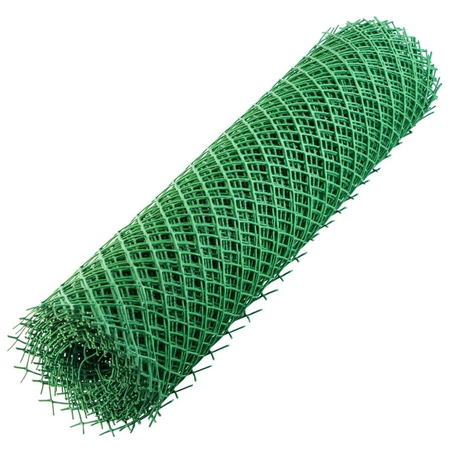 Зеленая пластиковая заборная решетка 64531, 1,3 х 20 м, в рулоне, с ромбовидными ячейками 70 х 55 мм, используется для создания изгороди.