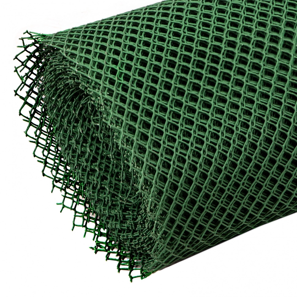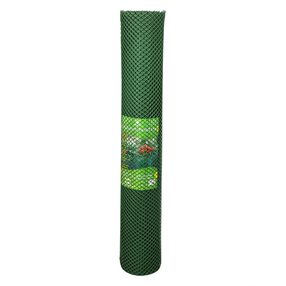 Зеленая пластиковая заборная решетка 64525, 1,6 х 25 м, в рулоне, с ромбовидными ячейками 22 х 22 мм, используется для создания изгороди.