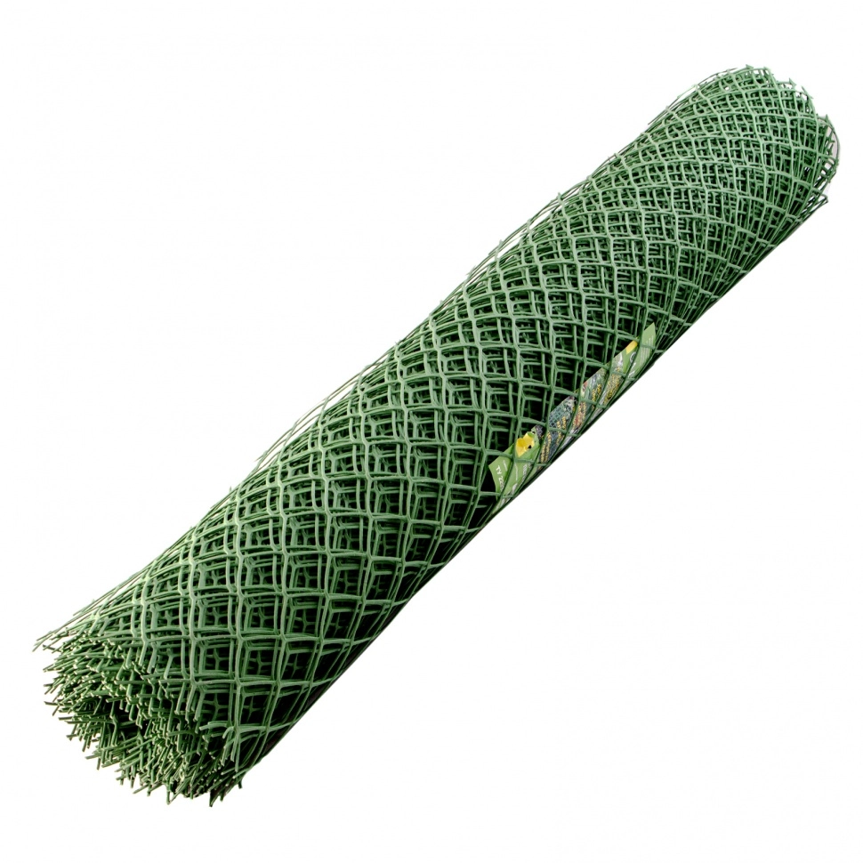 Зеленая пластиковая заборная решетка 64523, 1,5 х 25 м, в рулоне, с ячейками 70 х 70 мм, служит для ограждения садовых и жилых участков.