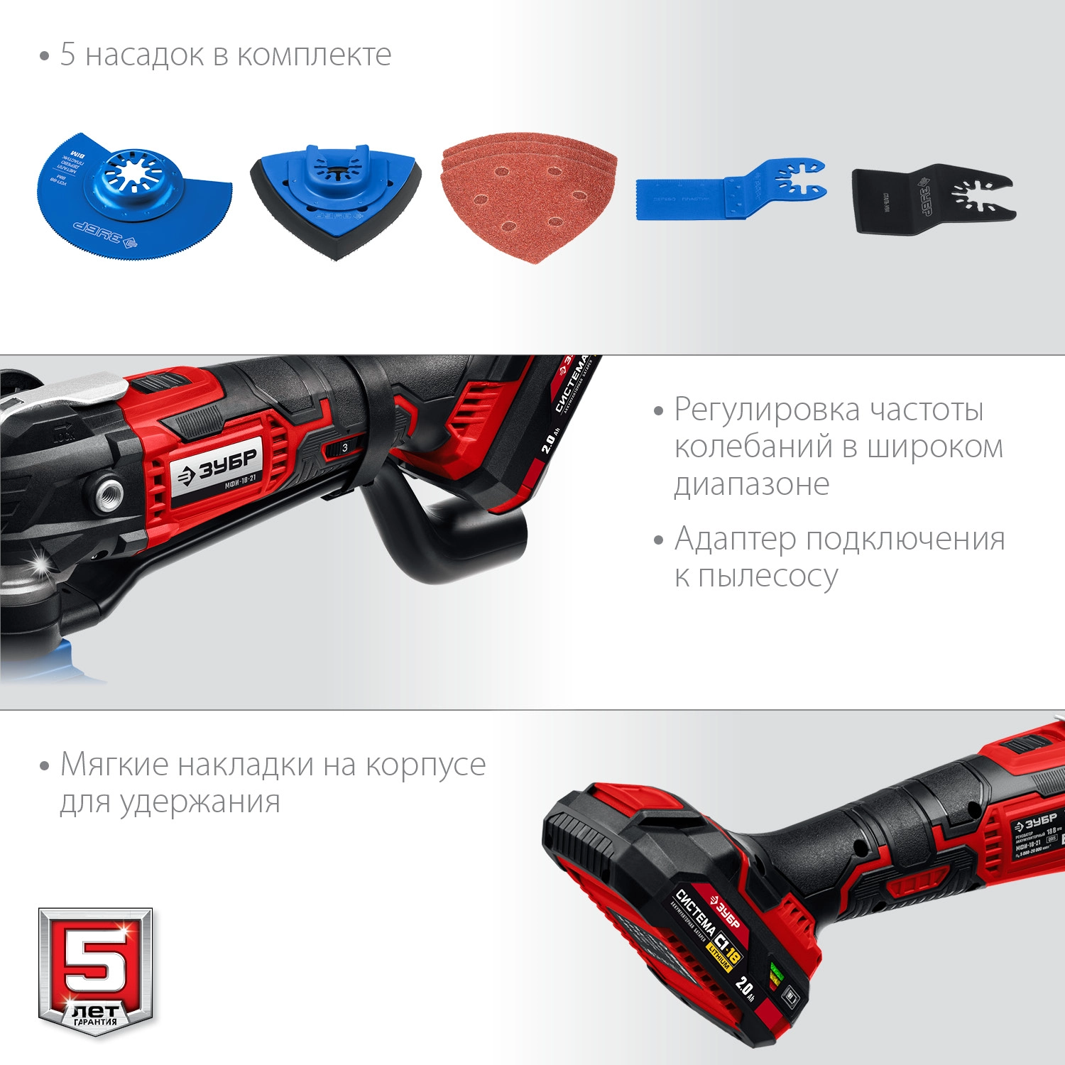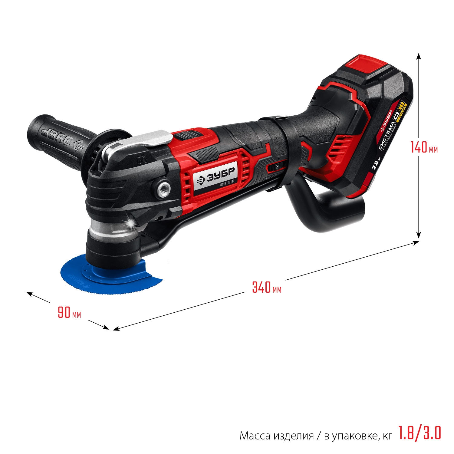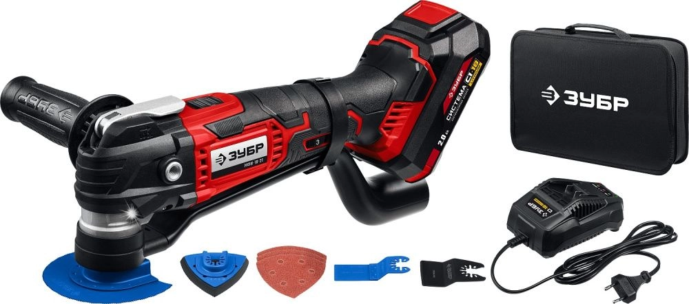 ПроизводителиРезак универс. аккум. МФИ-18-21 (18.0 В, 1акк. х 2.0А/ч, угол.колеб. 3гр.,набор насадок, сумка) ЗУБР