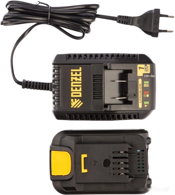 - Универсальность — аккумуляторная батарея Li-ion емкостью 2 Ач совместима с любым инструментом из модельного ряда единой платформы Denzel Battery System 18V.