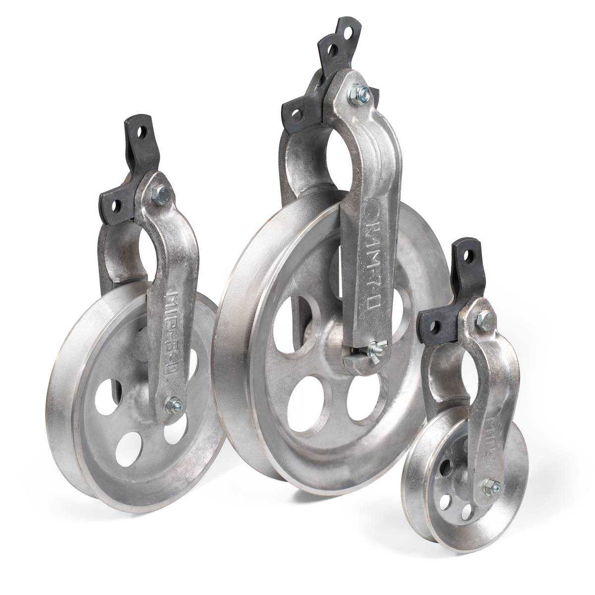 тип: РМ Диаметр ролика: 320 мм; Максимальный диаметр провода: 22 мм; Разрушающая нагрузка: 10 кН; Рабочая нагрузка: 5 кН; Сдвижная щека дает возможность, не снимая ролика с траверсы после раскатки провода, осуществить его выемку; Закрытые подшипники надежно защищают узел оси вращения от попадания грязи; Форма ручья гарантирует, что при небольших углах поворота линии электропередачи, провод не выпадет; Характеристики