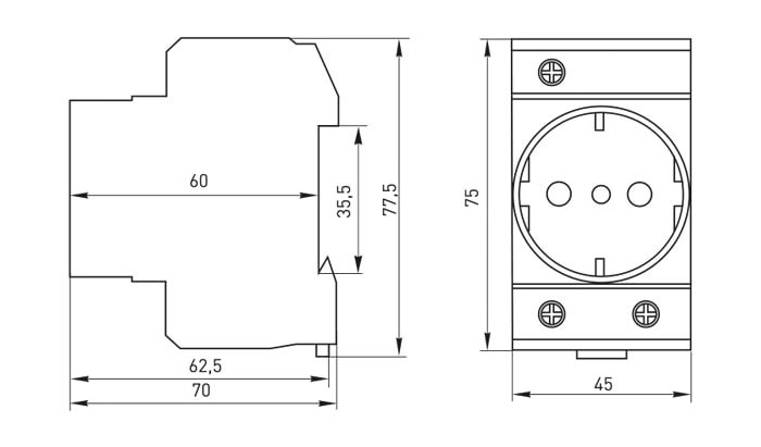 Розетка модульная с заземлением РДЕ-47 предназначена для применения в однофазных силовых и вспомогательных цепях переменного тока для подключения электрических приборов (переносных ламп, блоков питания и т.д.). Габаритные размеры для РДЕ-47
