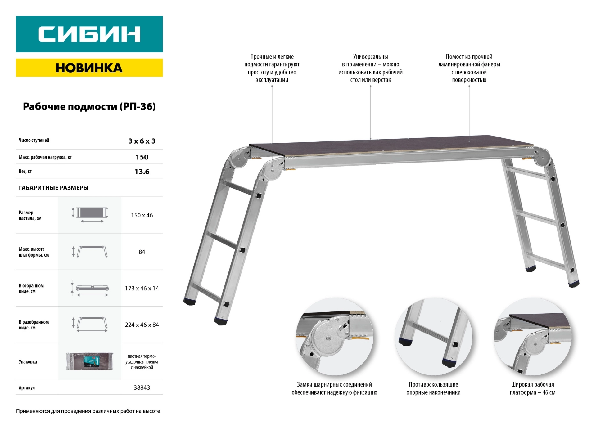 Похожие товарыКод товара: 0064481670.92 руб. Скидка 5% 638.71 руб. за штПодмости проф. рабочие, 3x6x3 ступени, алюм., складные с колесами и съемной площадкой. (38845) СИБИНКод товара: 0026588808.24 руб. Скидка 9% 735.49 руб. за штКод товара: 0026586Вышка-тура СИБИН это многофункциональная конструкция для ремонтно-отделочных и монтажных работ в доме и на улице. Устойчивая конструкция в сочетании с высококачественными материалами обеспечивают надежность и простоту эксплуатации.797.51 руб. Скидка 9% 725.74 руб. за штКод товара: 00728581 057.30 руб. Скидка 4% 1 013.23 руб. за шт - Оснастка к электроинструментам