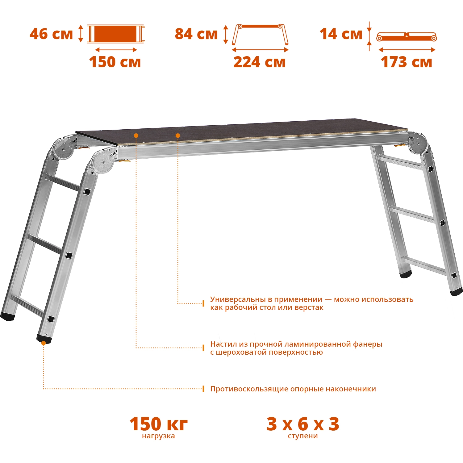ПроизводителиПодмости рабочие, 3x6x3 ступени, алюм., складные с фиксированной площадкой (38843) СИБИН