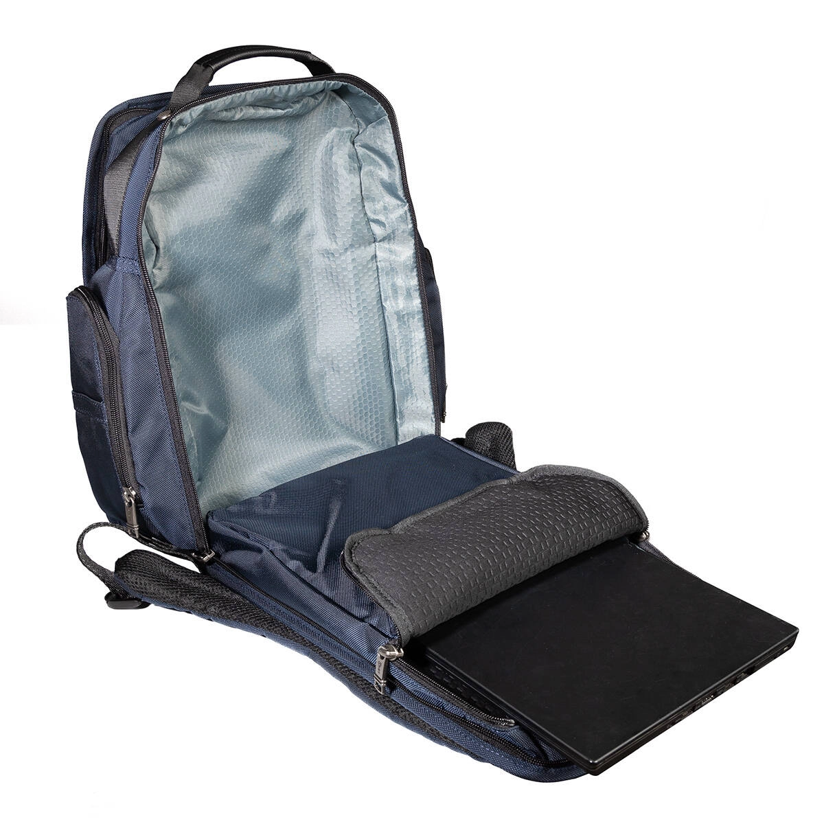 -второе отделение с отсеком на молнии для 15 дюймового ноутбука, стенки секции выполнены из мягкого материала, обеспечивающего сохранность ноутбука в путешествии, и отсеком для файлов с документами