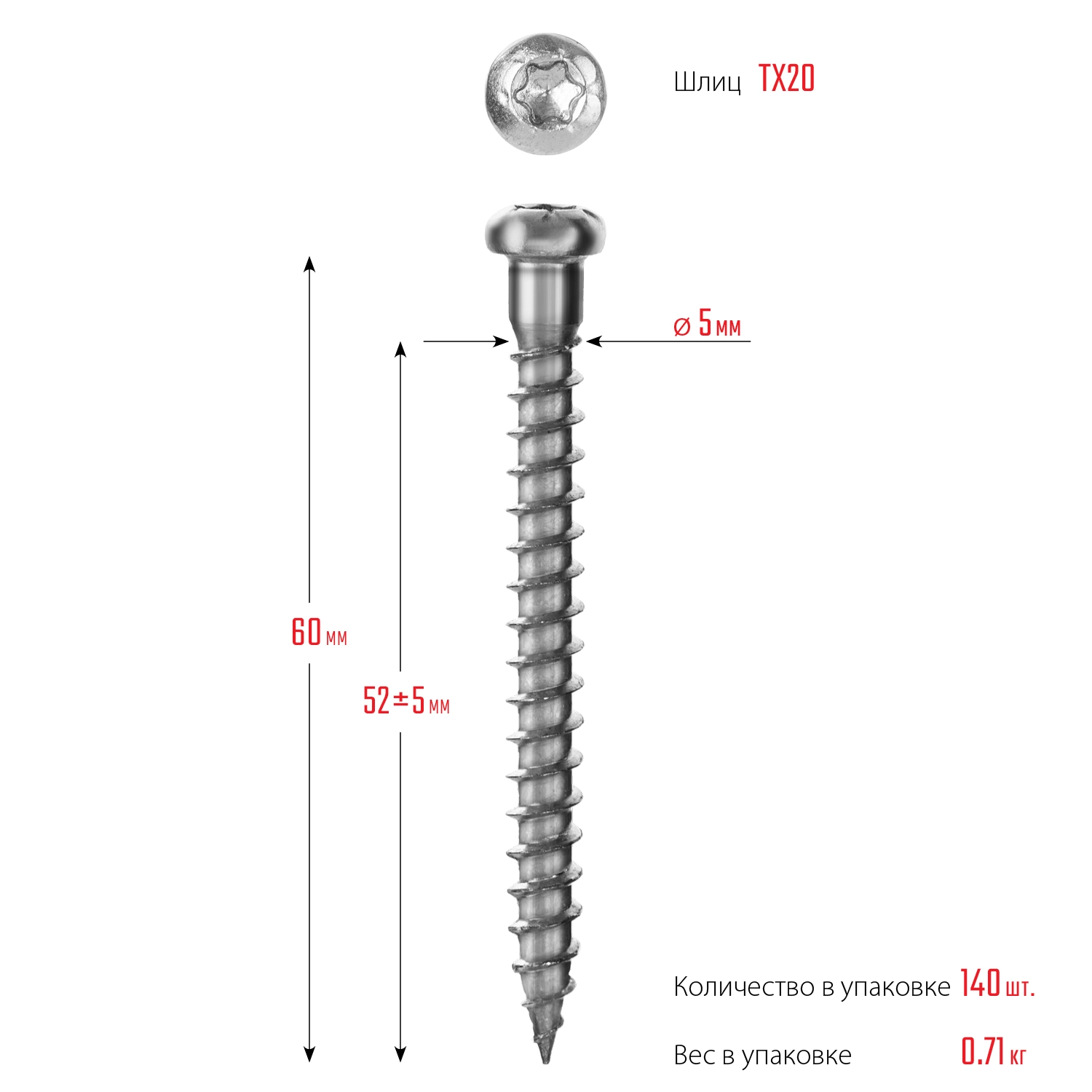 ПроизводителиСаморез для перфорированного крепежа 60 х 5 мм, TX20, цинк, 140 шт. (30061-50-60) ЗУБР
