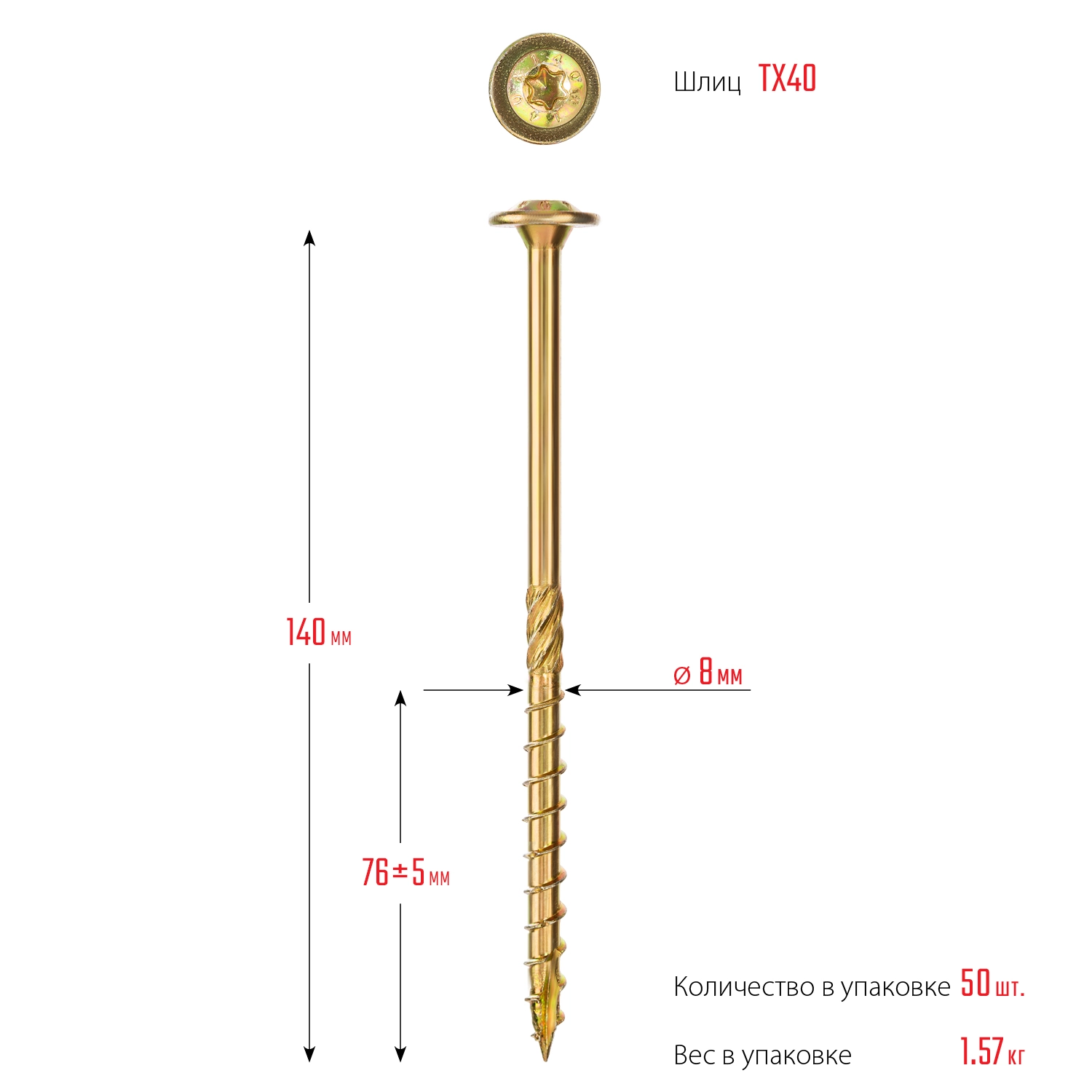 ПроизводителиСаморез конструкционный Ø 8.0х140мм, желтый цинк, тарельч. головка, TX40, 50шт. (30051-80-140) ЗУБР