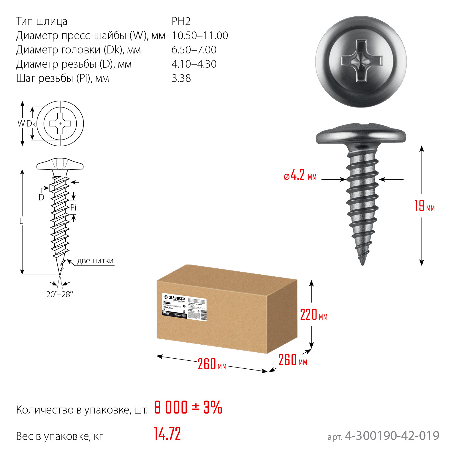 ПроизводителиСаморез с пресс-шайбой ПШМ 19х4.2мм, цинк, 14.72кг (4-300190-42-019_z01) ЗУБР