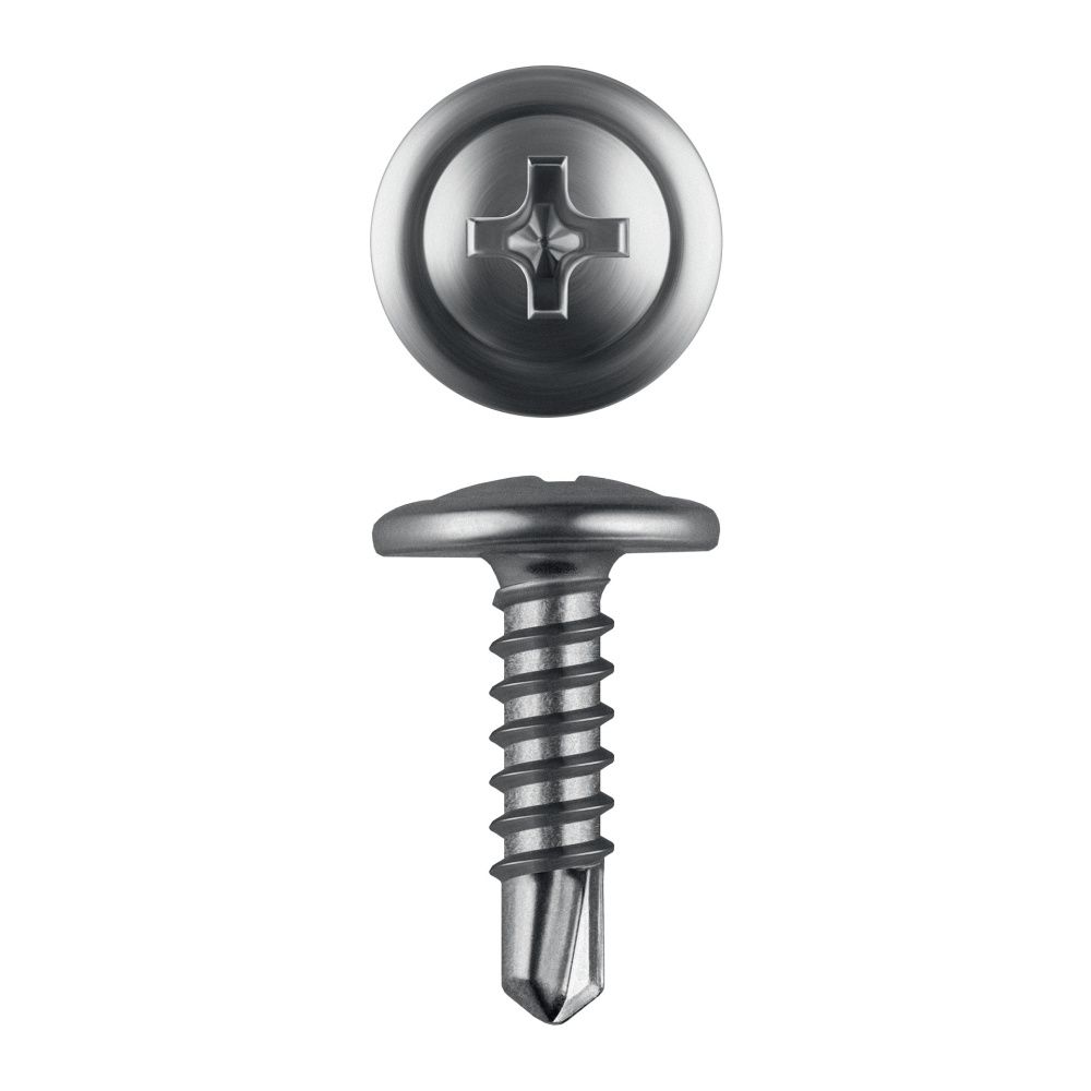 Саморезы с пресс-шайбой и сверлом для листового металла изготовлены из стального прутка с высоким содержанием углерода. Контроль за геометрией самореза начинается с калибровки прутка и заканчивается тщательной проверкой размеров готового изделия. Нормативная твердость стали достигается термической обработкой. Поверхностная твердость 560-720HV, твердость в сердцевине 240-425HV. Саморезы легко вкручиваются обычным шуруповертом или отверткой с крестообразным шлицем PH2 (DIN). Предварительное сверление в скрепляемых материалах не требуется. Геометрические размеры: диаметр пресс-шайбы (W) - 10.5-11.0мм, диаметр головки (Dk) - 6.5-7.0мм, диаметр резьбы (D) - 4.04-4.22мм, диаметр сверла (dp) - 3.1-3.2мм, длина сверла (ds) - 3.7-3.8мм, шаг резьбы (Pi) - 1.41мм.