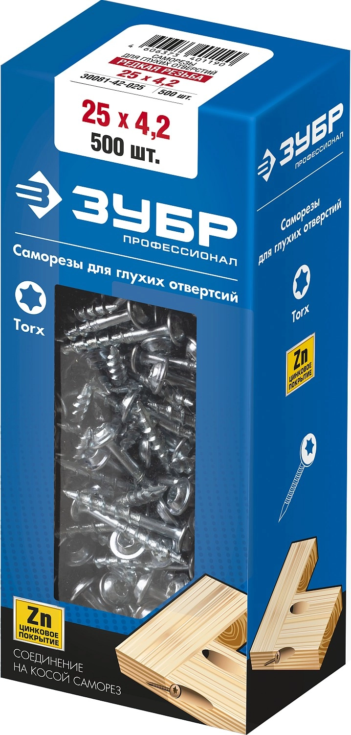 ПроизводителиСаморезы для глухих отв., 25 х 4.2мм, шлиц TX 20, редкая резьба, оцинк. 500шт. (30081-42-025) ЗУБР