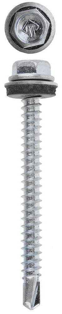 Шайба с прокладкой EPDM плотно прижимается к кровельному материалу, герметизируя просверленное отверстие. Шестигранная головка выдерживает большой крутящий момент и значительно облегчает вкручивание самореза. Геометрические размеры: диаметр шайбы (Dw) - 13.90-14.15мм, толщина прокладки (Ar) - 2мм, Размер под ключ (S) - 7.8-7.9мм, диаметр резьбы (D) - 4.75-4.95мм, диаметр сверла (dp) - 2.8-2.9мм, длина сверла (ds) - 4.0-4.8мм, шаг резьбы (Pi) - 2.12мм.