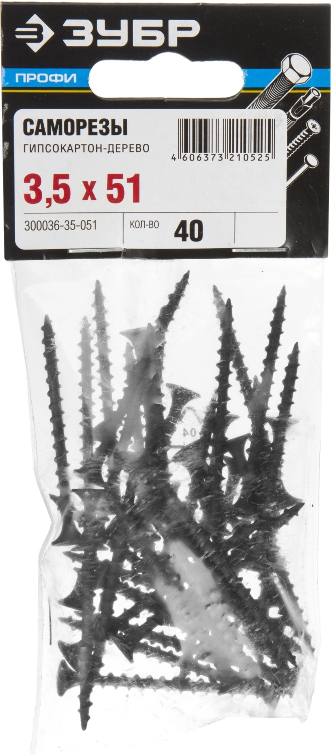 ПроизводителиСаморез для крепления ГКЛ в дерево Ø 51x3.5 мм крупный шаг фосфат 40шт. (300036-35-051) ЗУБР