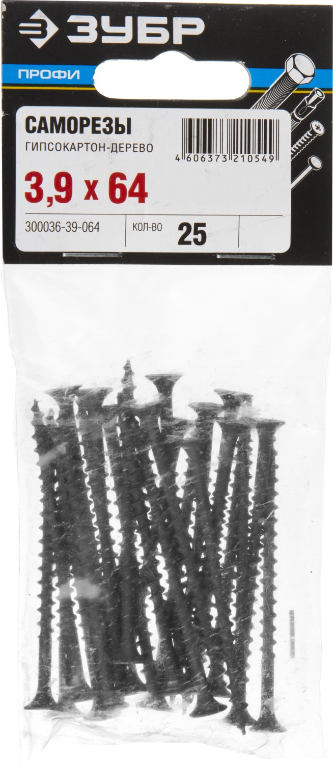 ПроизводителиСаморез для крепления ГКЛ в дерево Ø 64x3.9 мм крупный шаг фосфат 25шт. (300036-39-064) ЗУБР