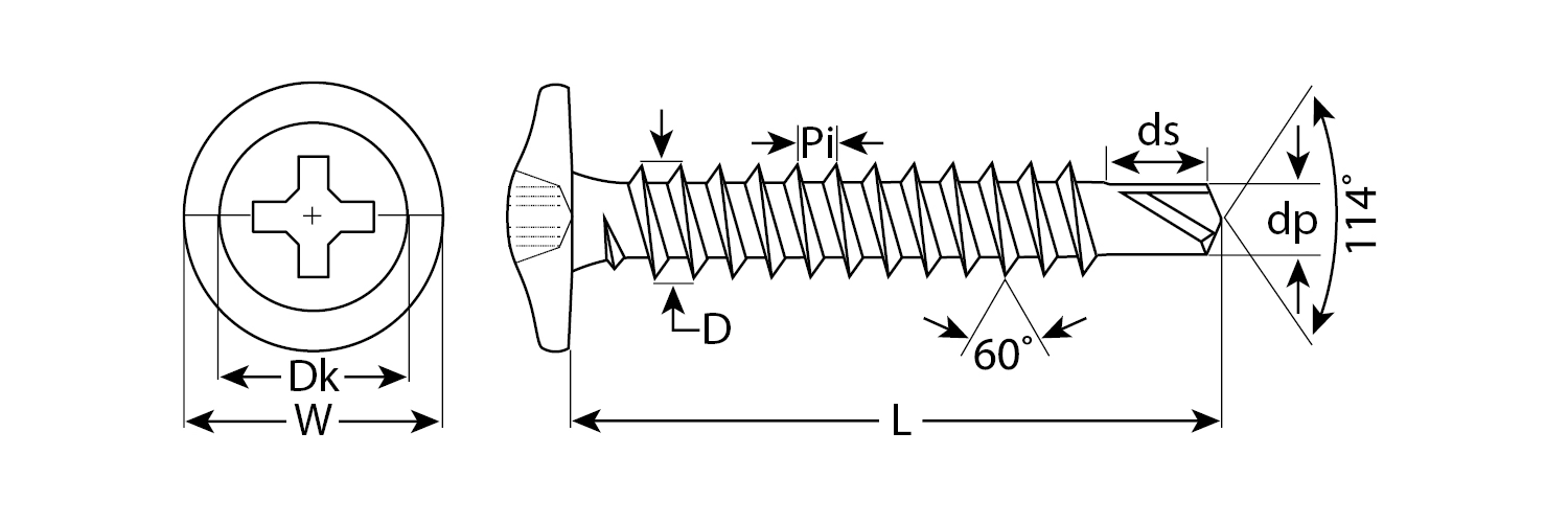 Саморезы легко вкручиваются обычным шуруповертом или отверткой с крестообразным шлицем PH2 (DIN). Предварительное сверление в скрепляемых материалах не требуется. Геометрические размеры: диаметр пресс-шайбы (W) - 10.5-11.0мм, диаметр головки (Dk) - 6.5-7.0мм, диаметр резьбы (D) - 4.04-4.22мм, диаметр сверла (dp) - 3.1-3.2мм, длина сверла (ds) - 3.7-3.8мм, шаг резьбы (Pi) - 1.41мм.