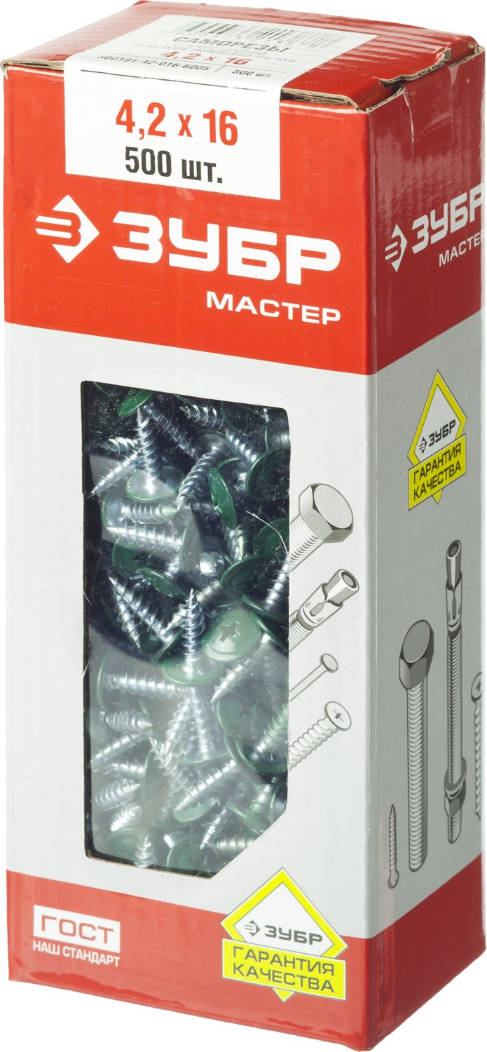 ПроизводителиСаморез с пресс шайбой Ø 4.2х16 мм RAL 6005 зеленый острый 500шт. (300191-42-016-6005) ЗУБР