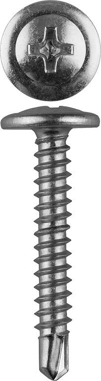Саморезы легко вкручиваются обычным шуруповертом или отверткой с крестообразным шлицем PH2 (DIN). Предварительное сверление в скрепляемых материалах не требуется. Геометрические размеры: диаметр пресс-шайбы (W) - 10.5-11.0мм, диаметр головки (Dk) - 6.5-7.0мм, диаметр резьбы (D) - 4.04-4.22мм, диаметр сверла (dp) - 3.1-3.2мм, длина сверла (ds) - 3.7-3.8мм, шаг резьбы (Pi) - 1.41мм.