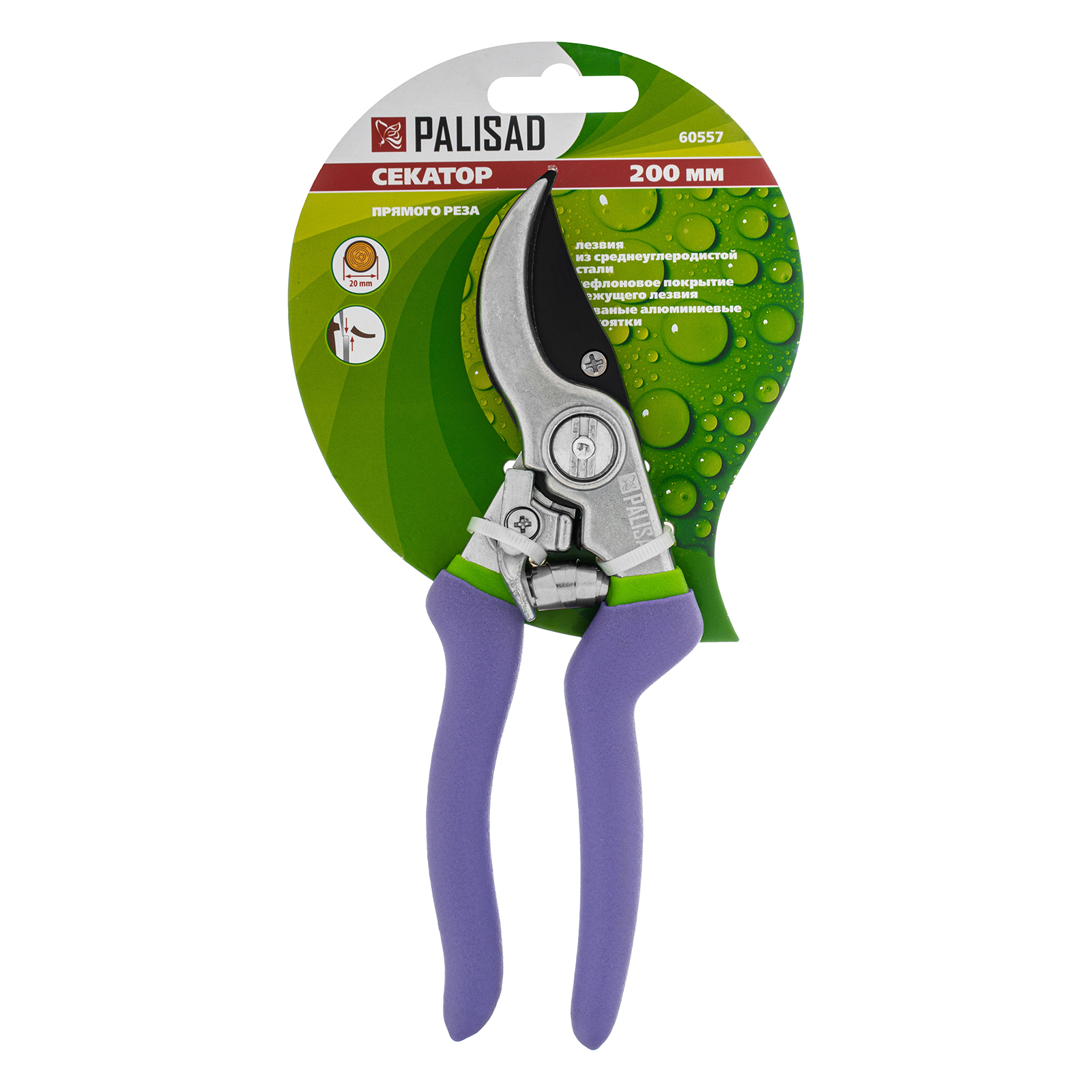 Секатор прямого реза Palisad 60557 длиной 200 мм, с металлическими обрезиненными рукоятками, используется для обрезки живых веток диаметром до 20 мм.