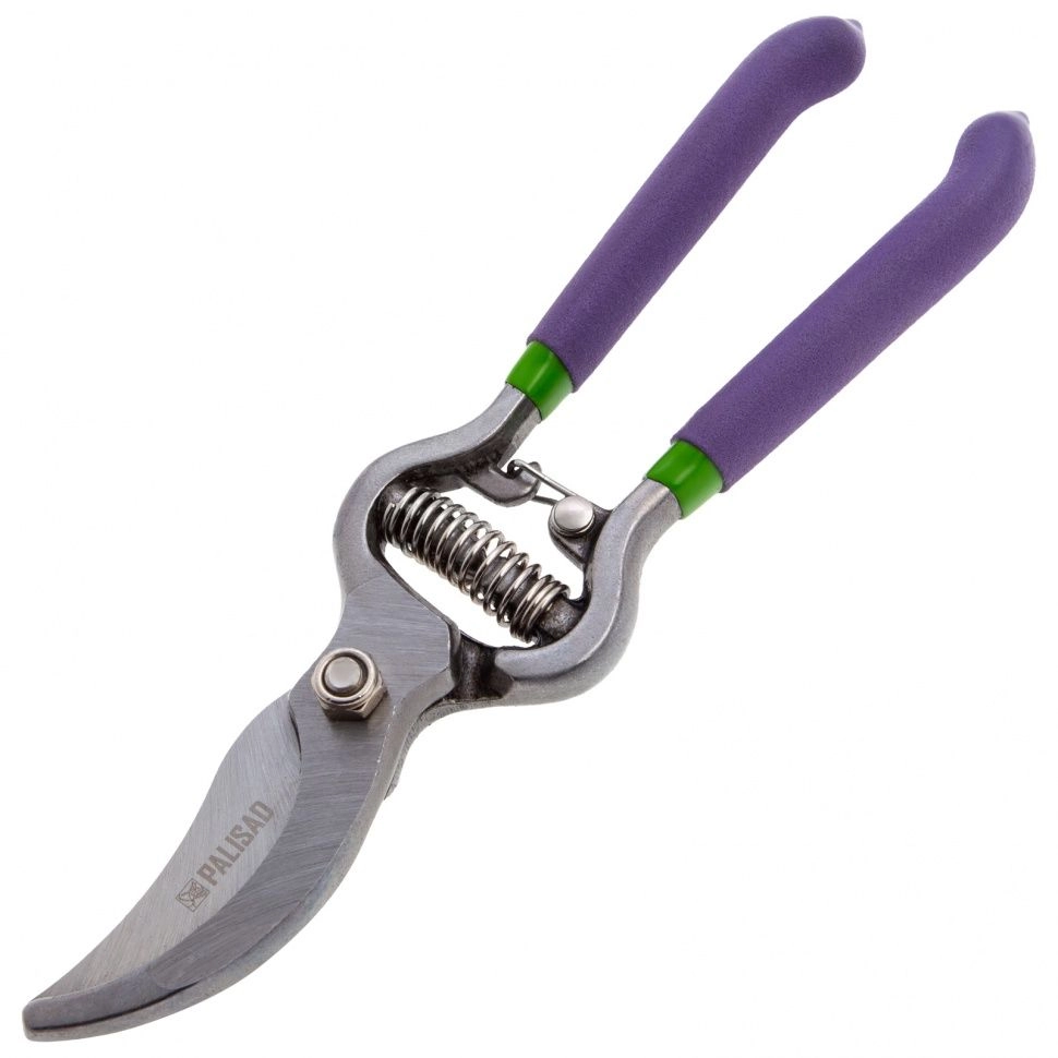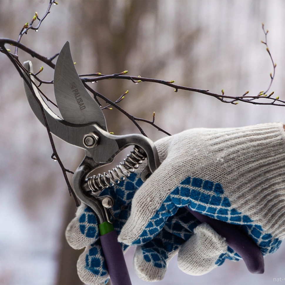 Секатор прямого реза Palisad 60561 с обрезиненными рукоятками, общей длиной 200 мм, используется для обрезки живых веток диаметром до 25 мм.