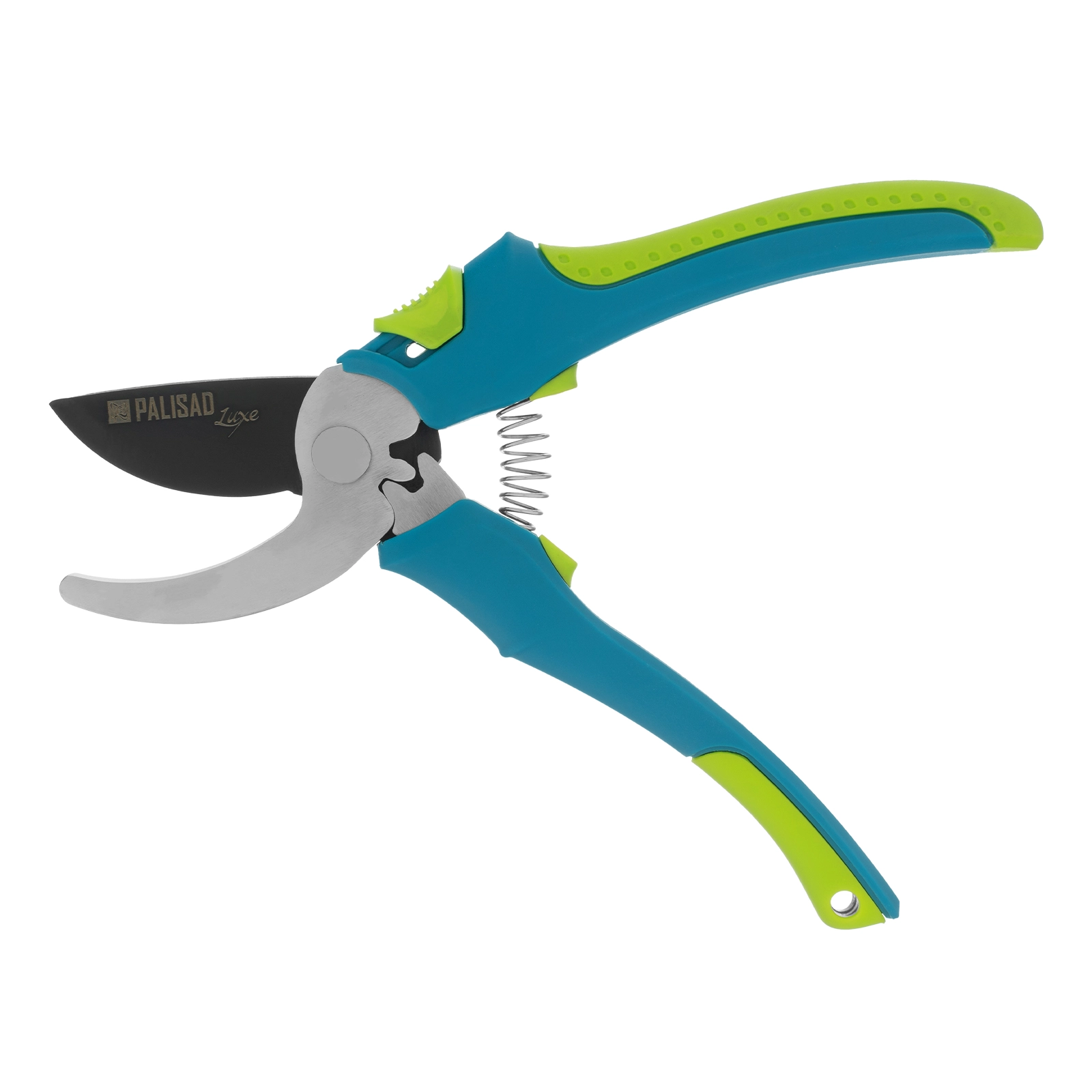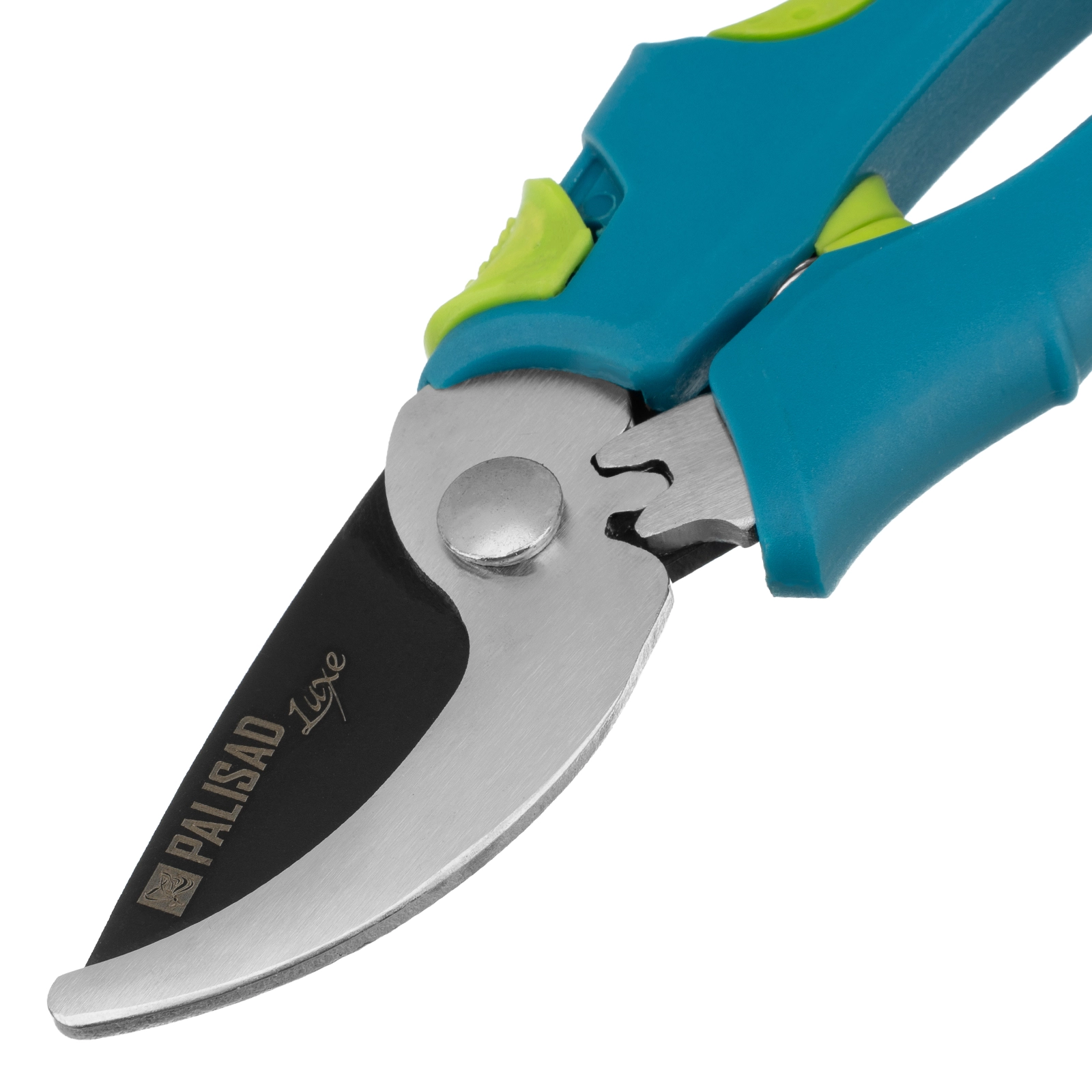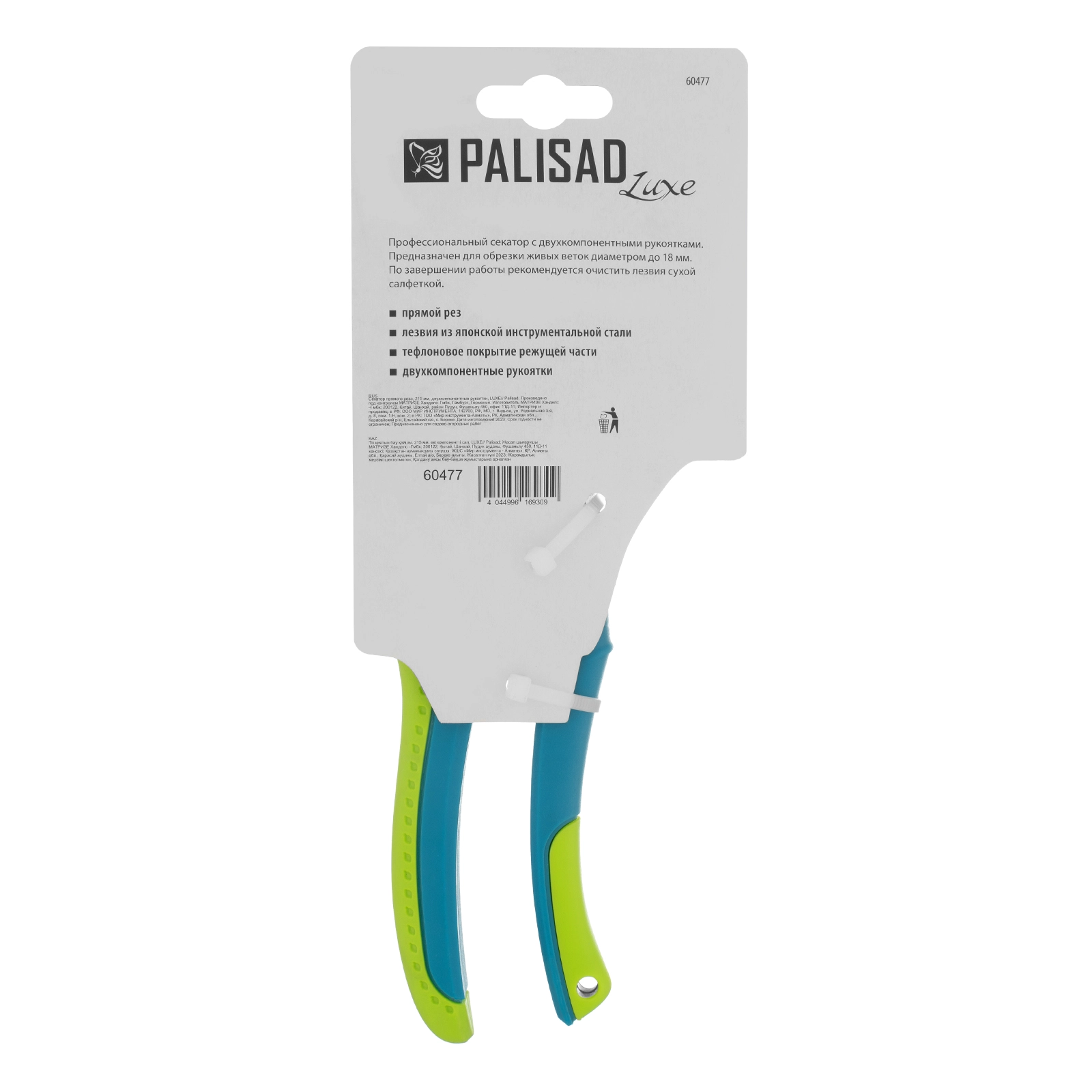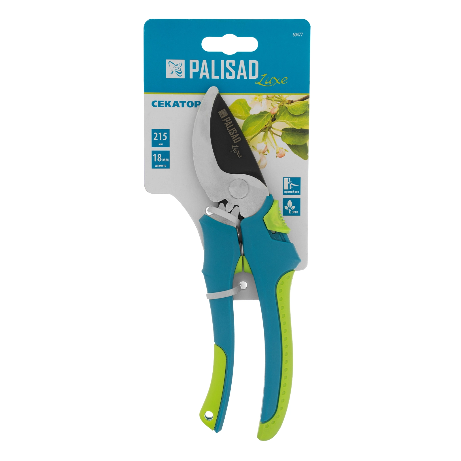 Секатор прямого реза Palisad LUXE 60477 длиной 215 мм, с двухкомпонентными рукоятками, — инструмент для обрезки живых веток диаметром до 18 мм.
