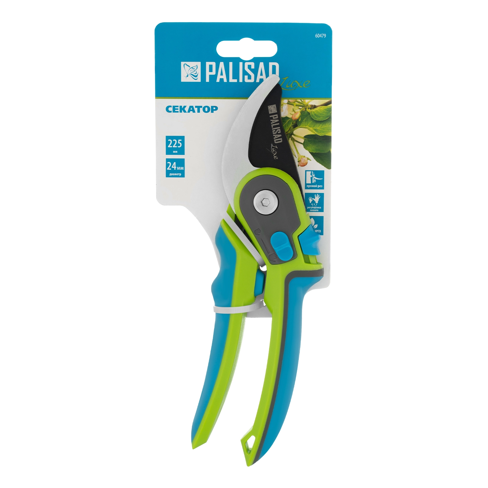 Секатор прямого реза Palisad LUXE 60479 длиной 225 мм, с регулировкой захвата и трехкомпонентными рукоятками, используется для срезания живых веток толщиной до 24 мм.