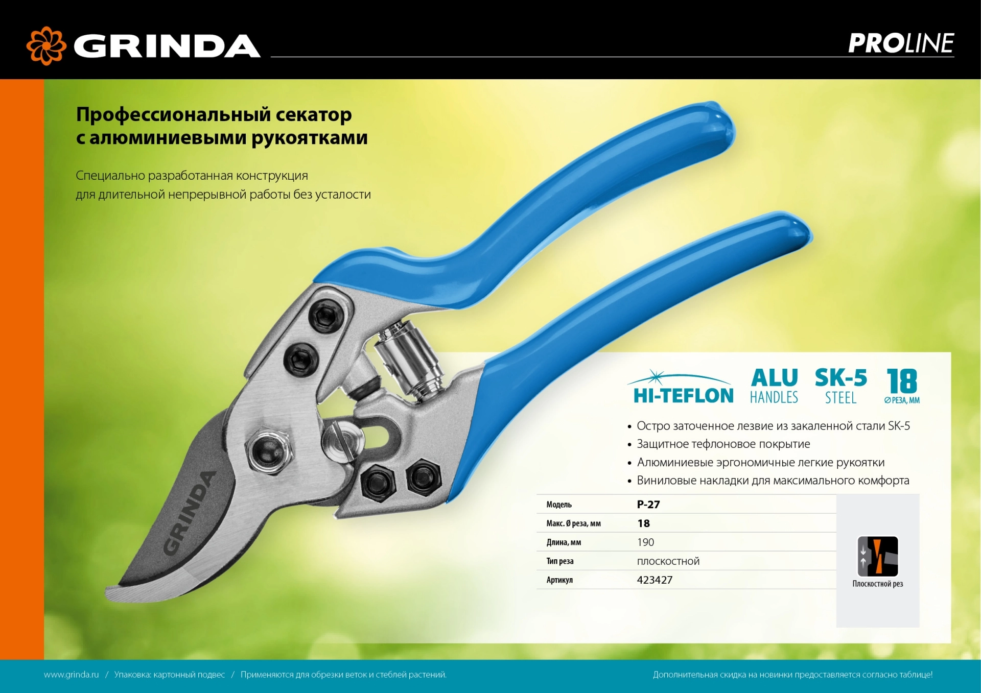 ПроизводителиСекатор с эргономичными алюминиевыми рукоятками, плоскостной, 190 мм, P-27 PROLine (423427) GRINDA