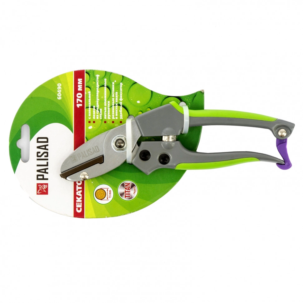 Секатор с наковальней Palisad 60490 длиной 170 мм, с металлическими обрезиненными рукоятками, используется для срезания сухих и увядших веток диаметром до 15 мм.