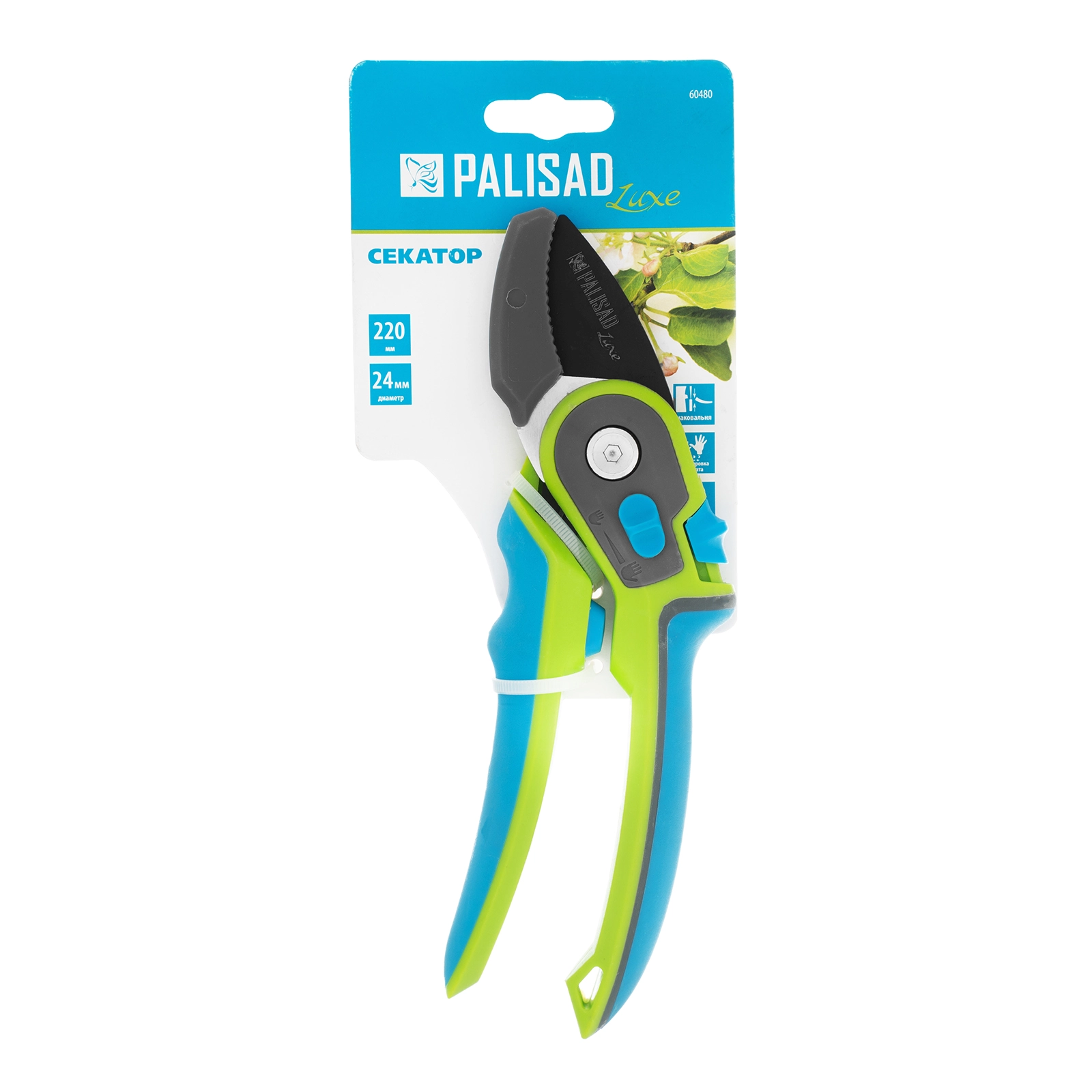 Секатор с наковальней Palisad LUXE 60480 длиной 220 мм, с регулировкой захвата и трехкомпонентными рукоятками, предназначен для обрезки сухих и увядших веток толщиной до 24 мм.